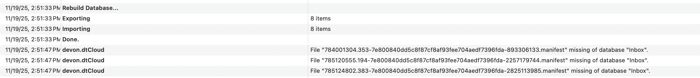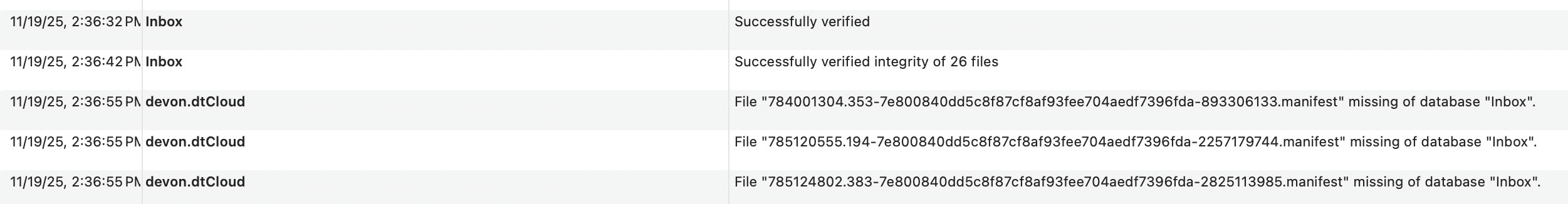 File “785120555.194-7e800840dd5c8f87cf8af93fee704aedf7396fda-2257179744.manifest” missing of database “Inbox”.