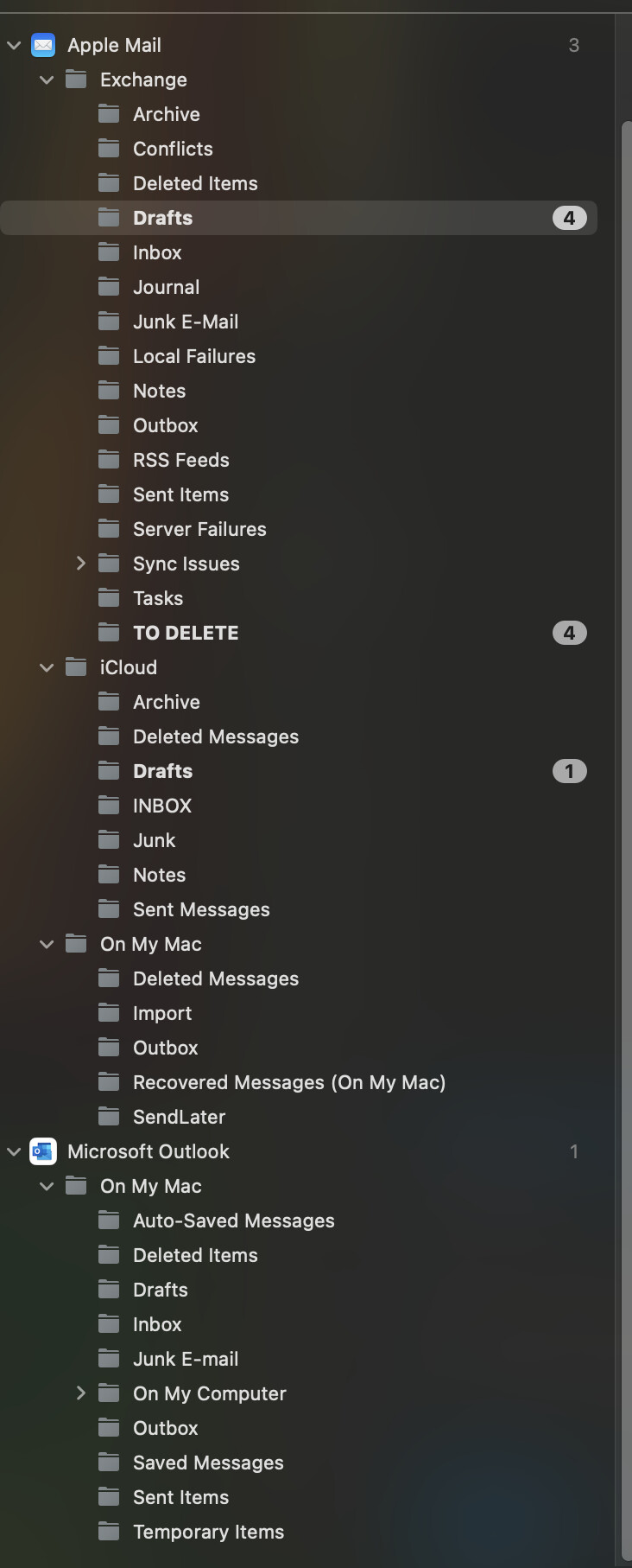 Here is the way the folders are showing up for Apple Mail (which I no longer use but have emails and want to import) and Microsoft Outlook (which I currently use and want to import).
