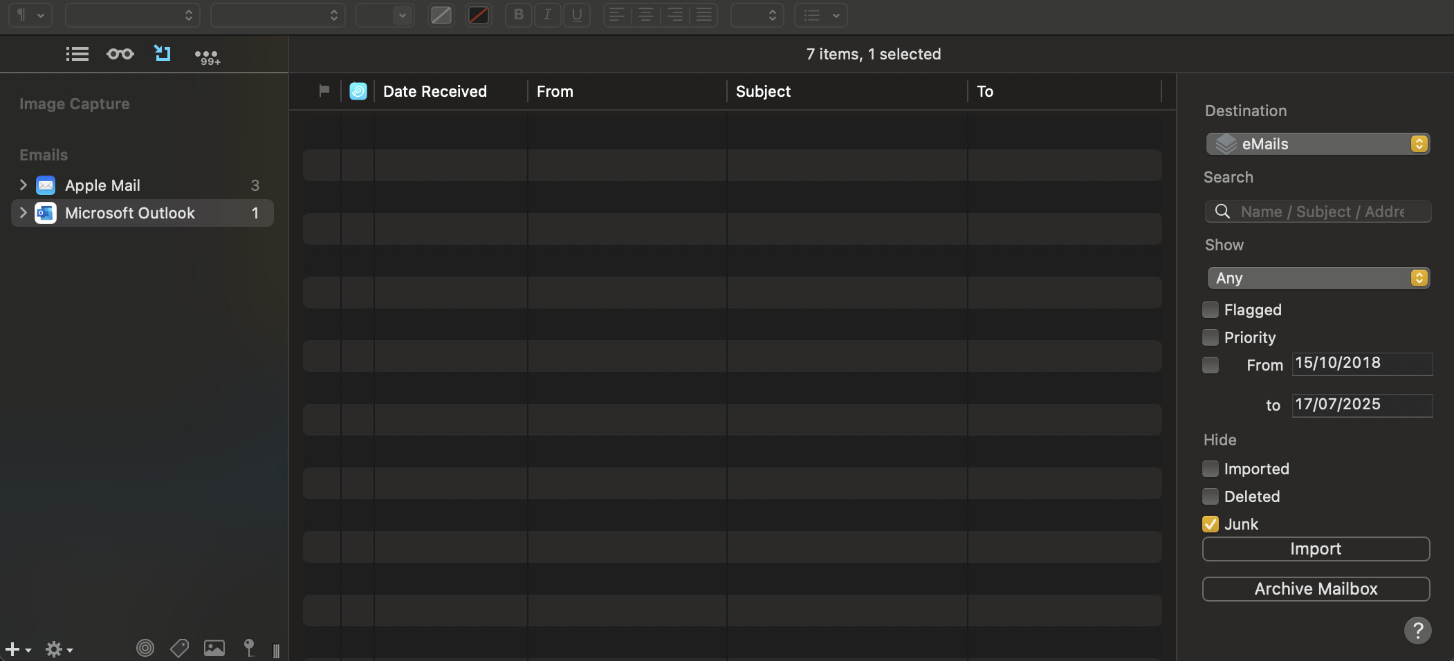 I found one email imported from Apple Mail.