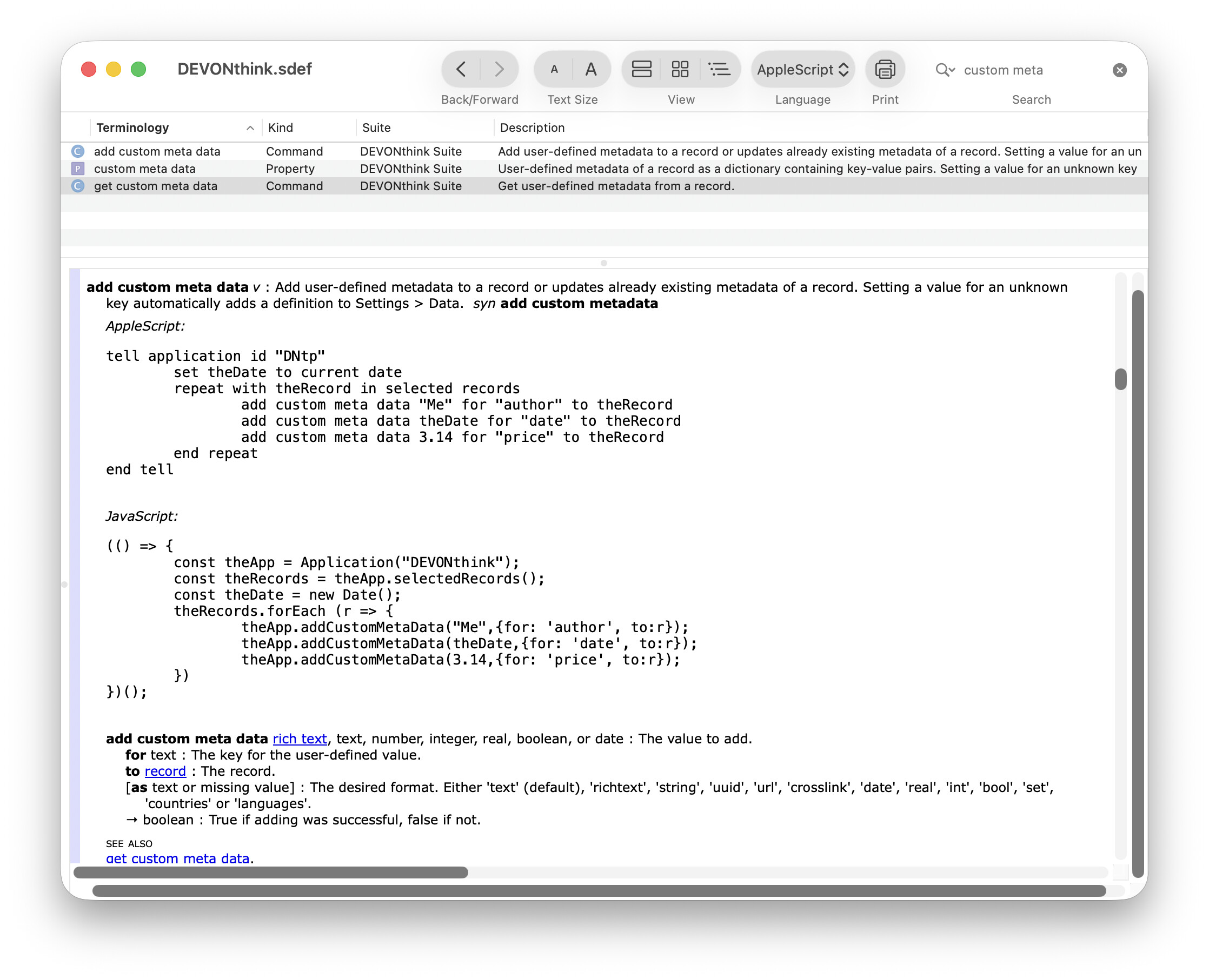 Finally, you might have a look on DEVONthink’s script suite in the Script Editor.app for additional notes and examples:
