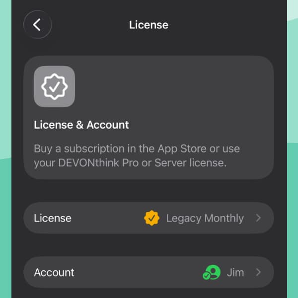 Starting with DEVONthink To Go 4, you can also use your license for DEVONthink Pro or Server 4 to register DEVONthink To Go. In the License & Account settings, tap Account. Log into your DEVONtechnologies account. Once you’re signed in, it will switch to the License pane. To attach a seat, tap the Register button to the right of your license. Enter a recognizable name for the device, e.g., Work iPad. The device is now linked to your DEVONthink license.