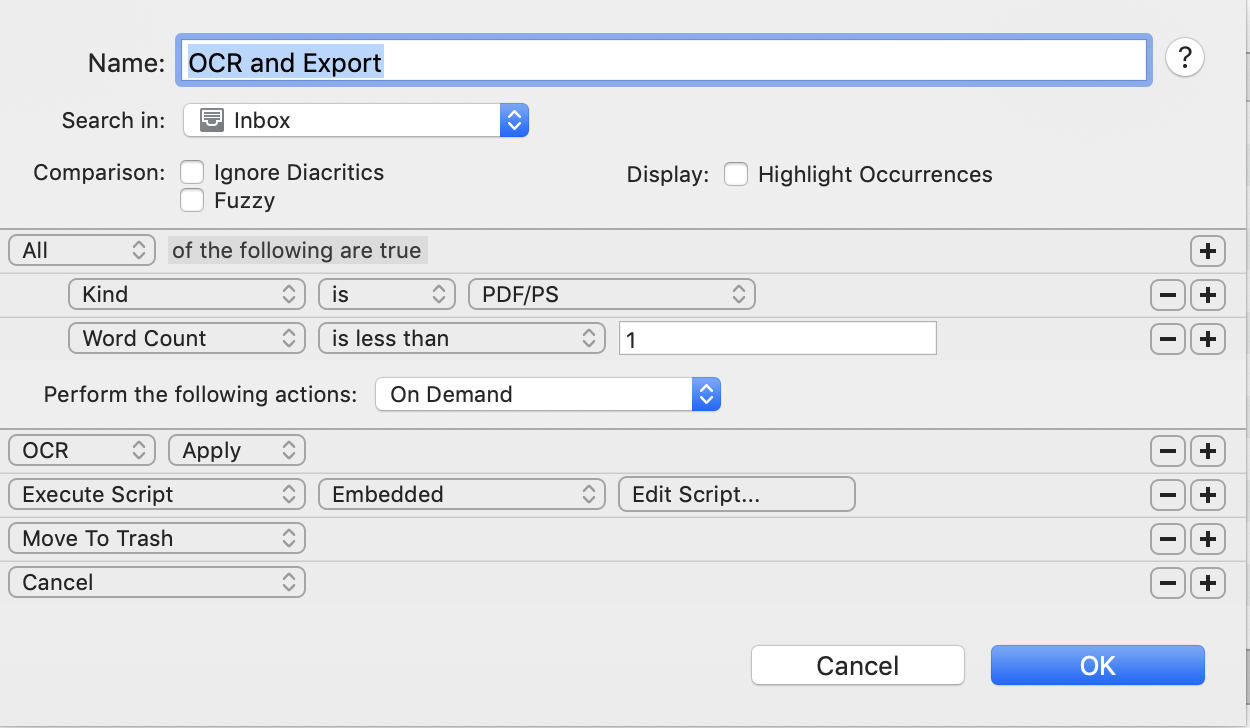 (You may want to specify a “search in” location that will be used only for OCRing, as this rule will operate on every non-OCRd PDF in the specified location.)