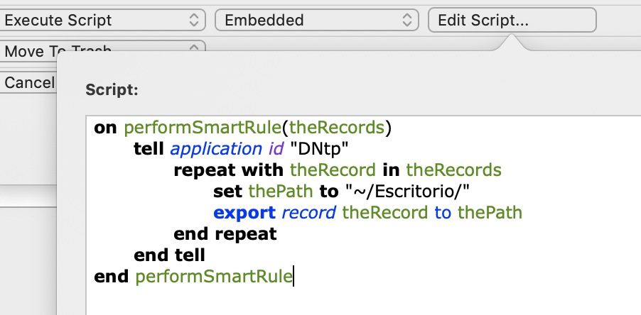 The Embedded Applescript is as shown here, and assumes that “Escritorio” is at the top level of your home folder…if not, use the complete path, for example ~/Documents/Escritorio/
