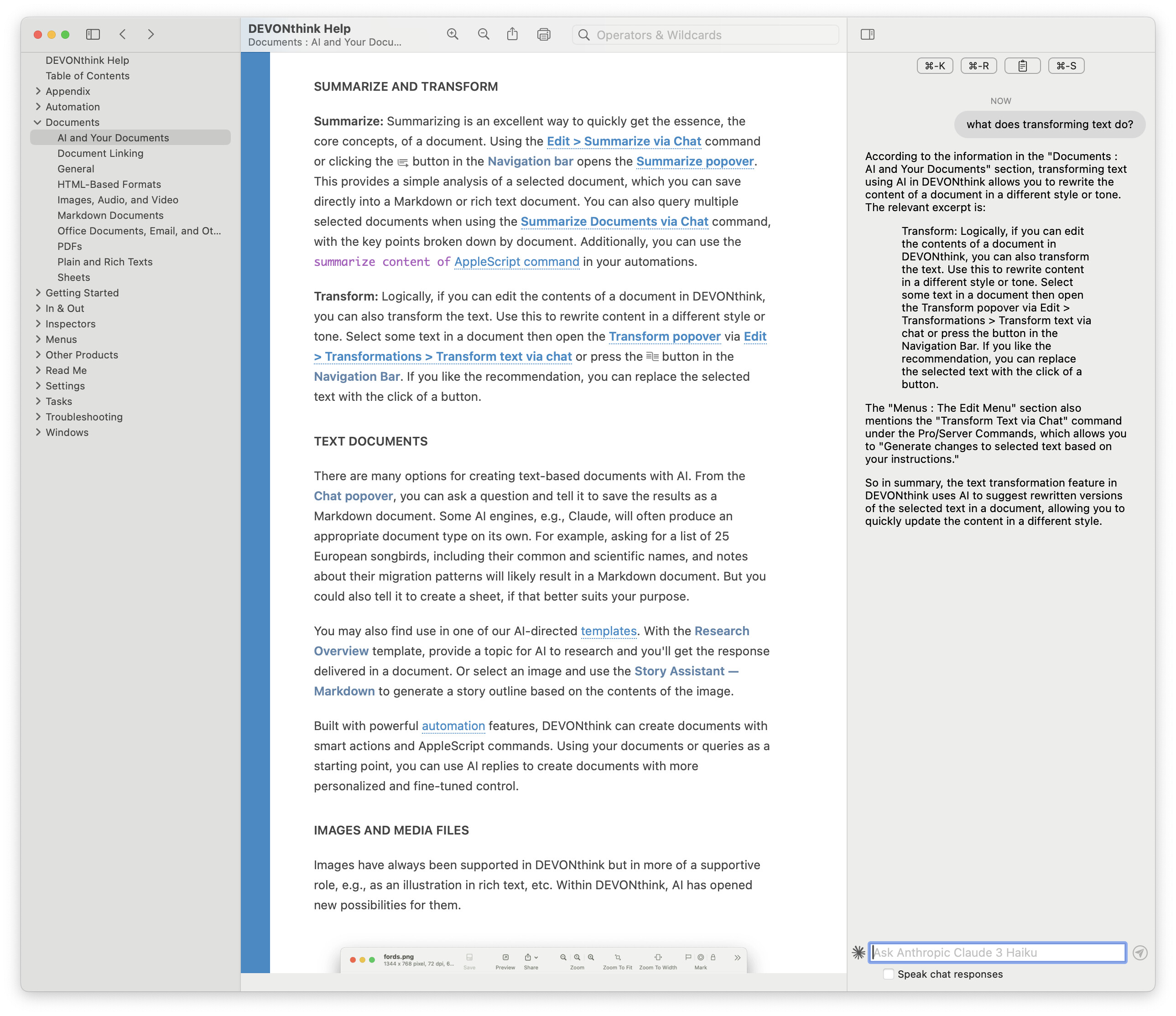 So the question stands for me: How can I do the transform of a text portion of a DEVONthink document through DEVONthink’s own AI tools?