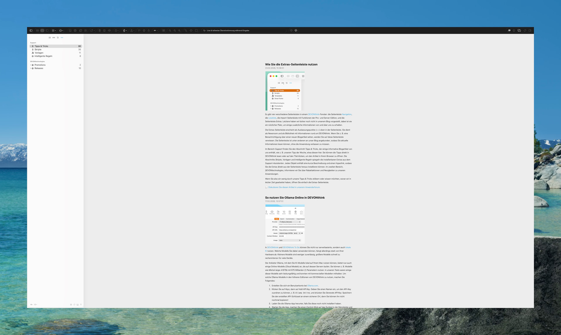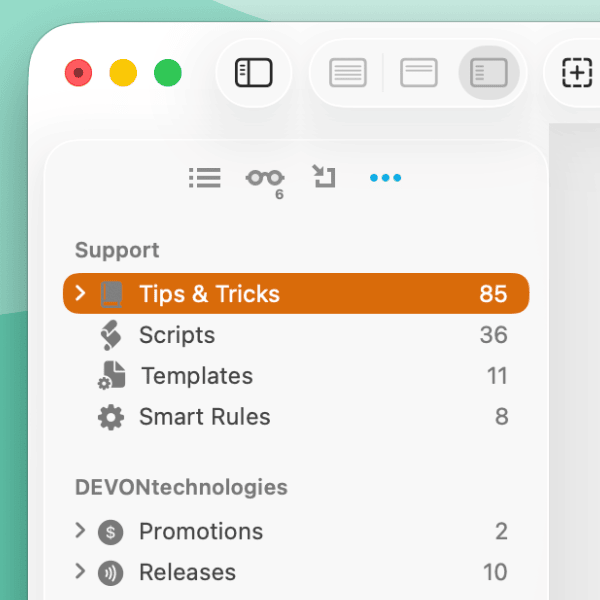 This last of the sidebars appears as an ellipsis (•••). It functions as a newsroom and a library of DEVONthink-related information. If you see a notification about a new blog post, etc., it’s directing you to this sidebar. Connected to online resources, like our blog, it provides up-to-date information without you having to leave the application.