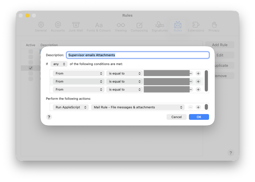 I want to create a rule in apple mail which imports mail and attachments from my PhD supervisors into the “Supervisor Emails” group.