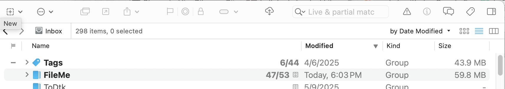 And then the top of the normal list view of the Inbox (showing that FileMe is an Indexed Folder group in the Inbox):