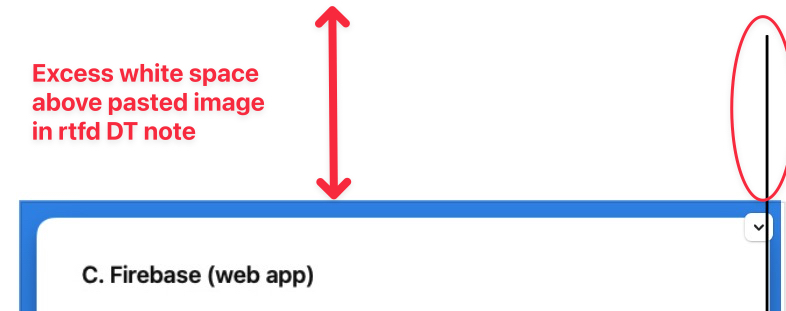 As expected, the note converts to RTFD on image paste. However, sometimes the pasted image ends up with a large amount of white space above it, pushing it down in the note. Other times, the image inserts cleanly with no extra space.