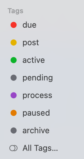 The project lives there permanently. While it’s active, I tag the project folder so I can surface it in Smart Groups. When it’s finished, I just remove the tags — nothing needs to be moved around when the project is completed