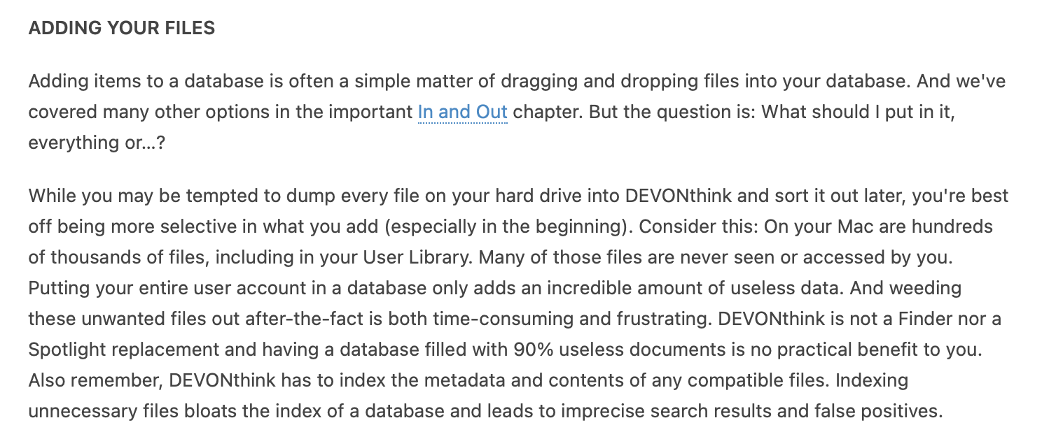 While DEVONthink can handle large amounts of data, it is inadvisable to import or index uncurated data, like entire hard drives or your Home directory. You should be judicious in what you put into your databases.