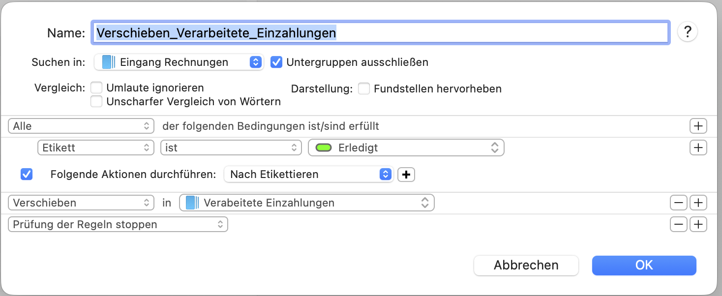 Hallo Zusammen, nach langer Zeit und Arbeit mit Devonthink melde ich mich wieder. Es geht um meine Intelligente Regel die Regelmässig nicht funktioniert. Ich habe Sie auch kopiert und anders benannt. Leider macht sie nicht das was sie soll. Habt Ihr evt. einen Lösungsvorschlag? LG Luigi
