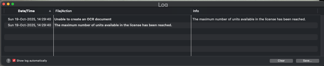 If you get this error, quit and restart DEVONthink, this will reset the ABBYY OCR. ABBYY is aware of the issue and we are awaiting the next update from them.