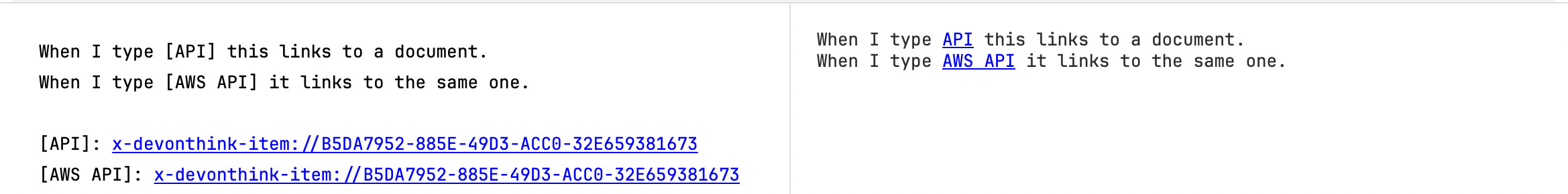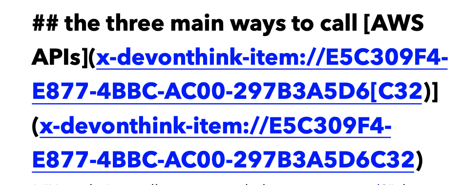 In the main document, where there are instances of “AW APIs”, when I select: tools > item links > convert wikilinks to item links, the display updates to show for “AW APIs” : AWS APIs](x-DEVONthink-item://E5C309F4-E877-4BBC-AC00-297B3A5D6C32)