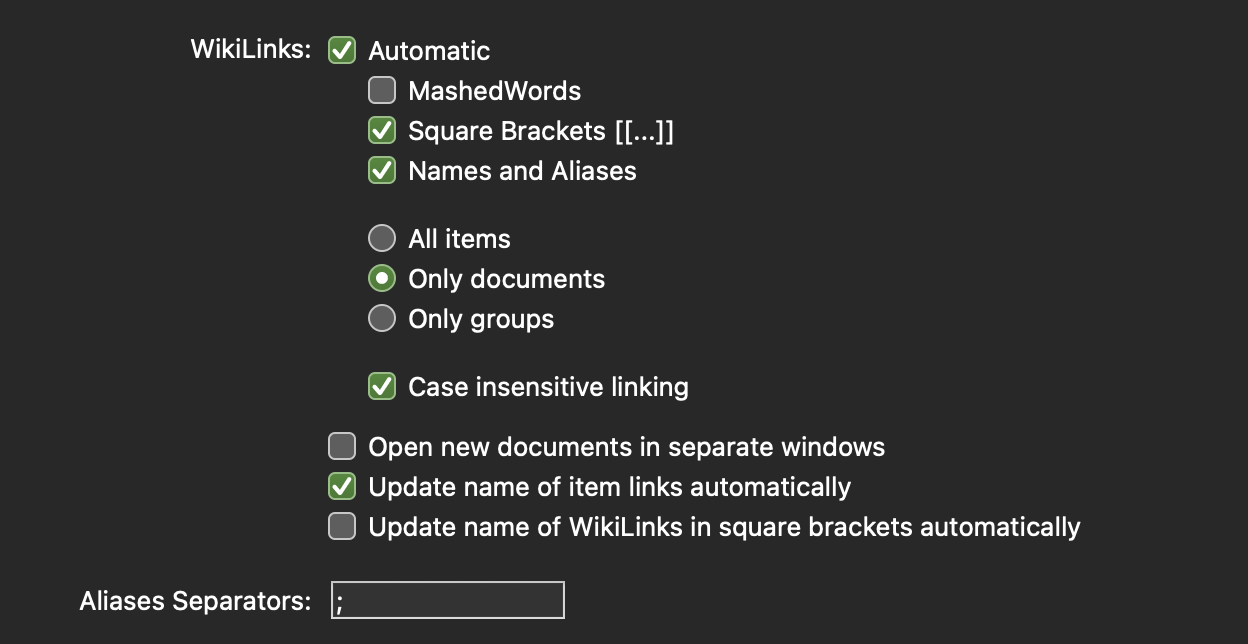 I never really started using aliases. I do uses WikiLinks some of the time. But I don’t have a lot of experience with how they interact.