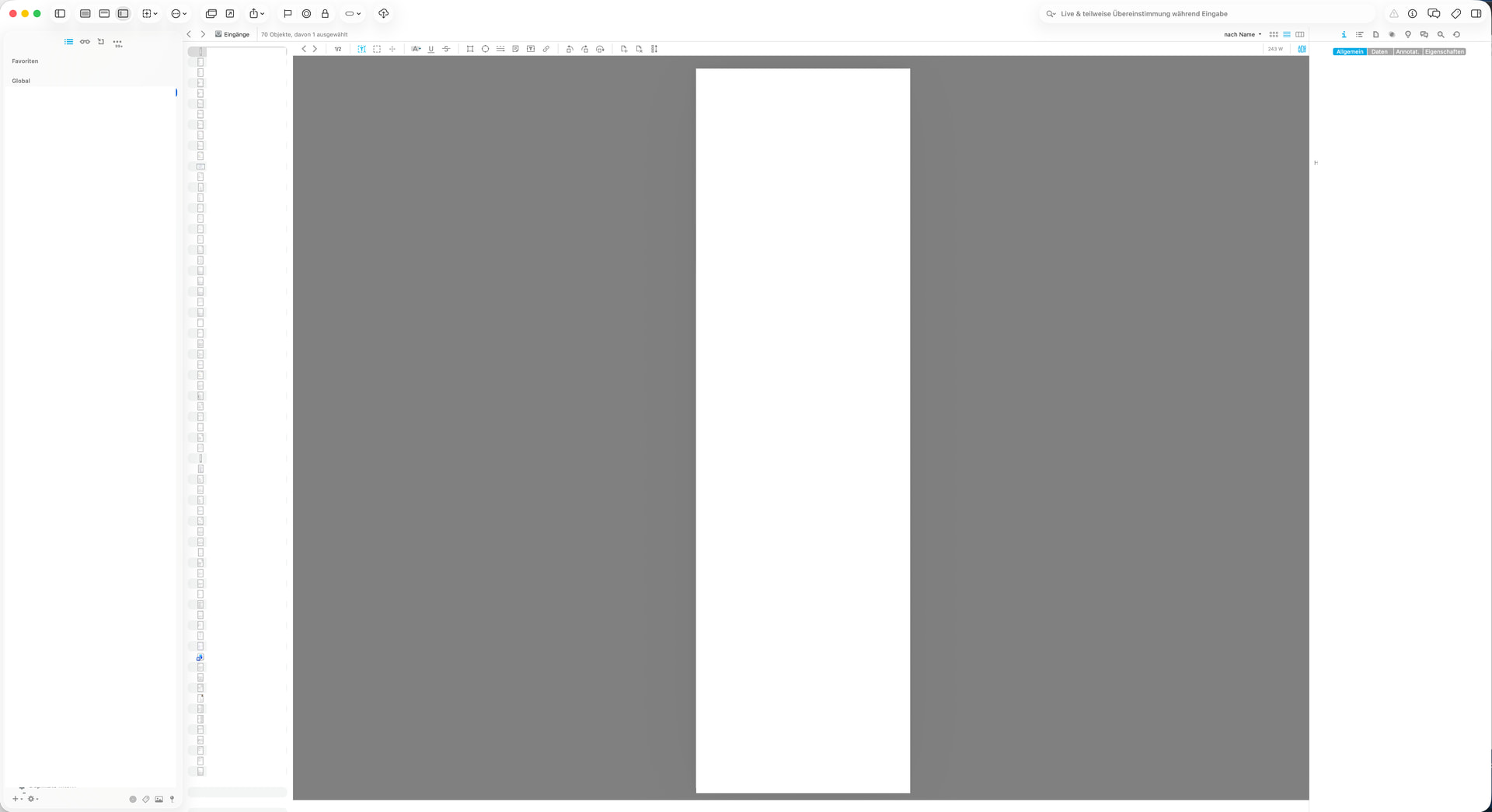 Ahh… Jetzt sehe ich es. Die Elementliste wird enger, weil sich der Ansichts-/Bearbeitungsbereich ändert. Dies könnte ein Fehler bei der Fensterbehandlung von macOS Tahoe sein. Haben Sie auch die Inspektoren auf der rechten Seite geöffnet? Sehen Sie das gleiche Verhalten, wenn Sie die Inspektoren schließen und dann beenden und neu starten?