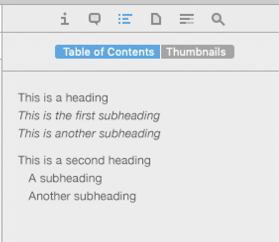 TOC lists all sentences that are fulled bolded or underlined. It would be nice to have a preference to specify if those styles represented headings or subheadings, and then have the inspector show this difference. For example, putting some linespace above a heading to separate it, and making the subheadings italicized or indented.