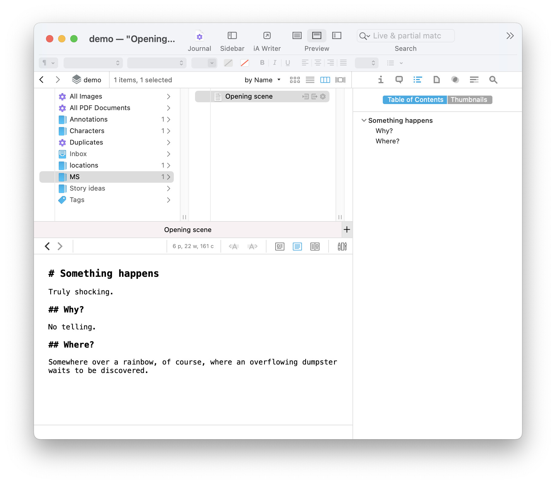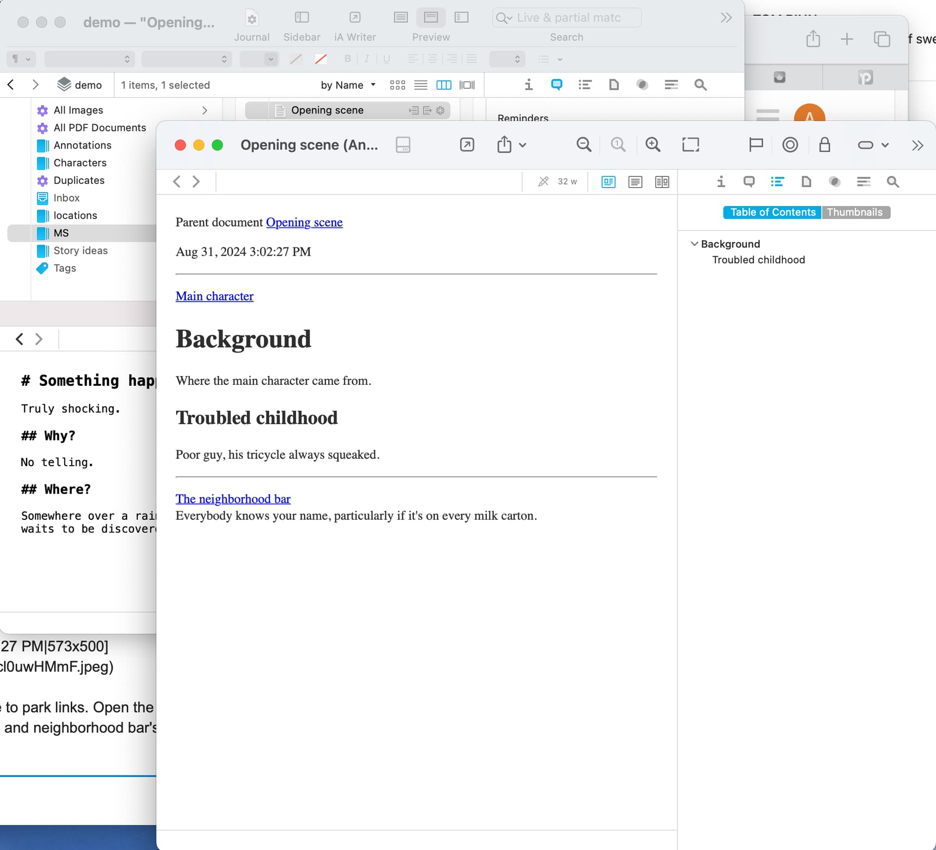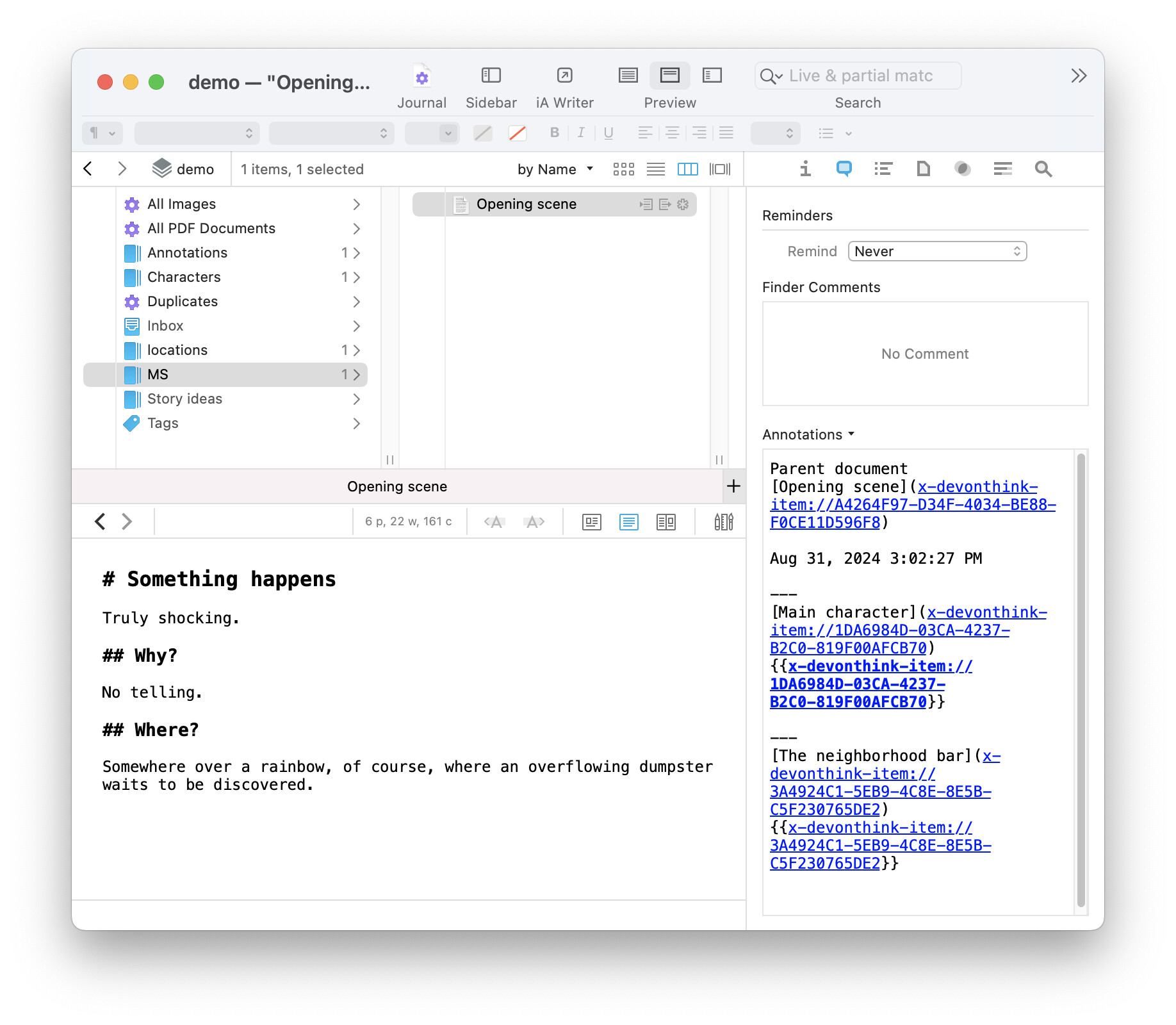 Imagine storyboarding a novel in Devonthink. Here’s the notes for the opening scene: