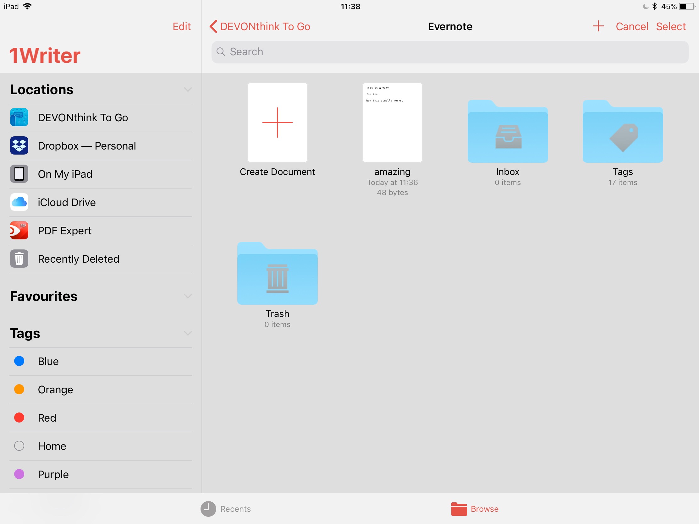 Greg, tried this just now and it works beautifully! Thank you, didn’t think of using the Files app. Any idea why when i am in the ‘Browse Files app’ view in 1Writer, the search box doesn’t reveal any of the files i have in DTTG? In the attached screenshot, searching for “amazing” yields an empty list for some reason.