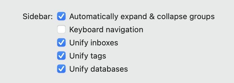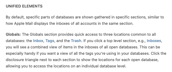 PS: I just noticed – if I uncheck Unify Inboxes I have Inboxes in all my databases, but not in the Global list. If I check it, I have a list of open database Inboxes under Global Inbox, but some of my databases do not have a local Inbox, and the missing Inboxes are all in newly created databases.