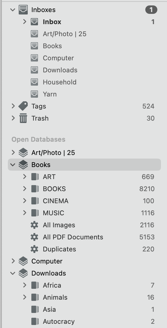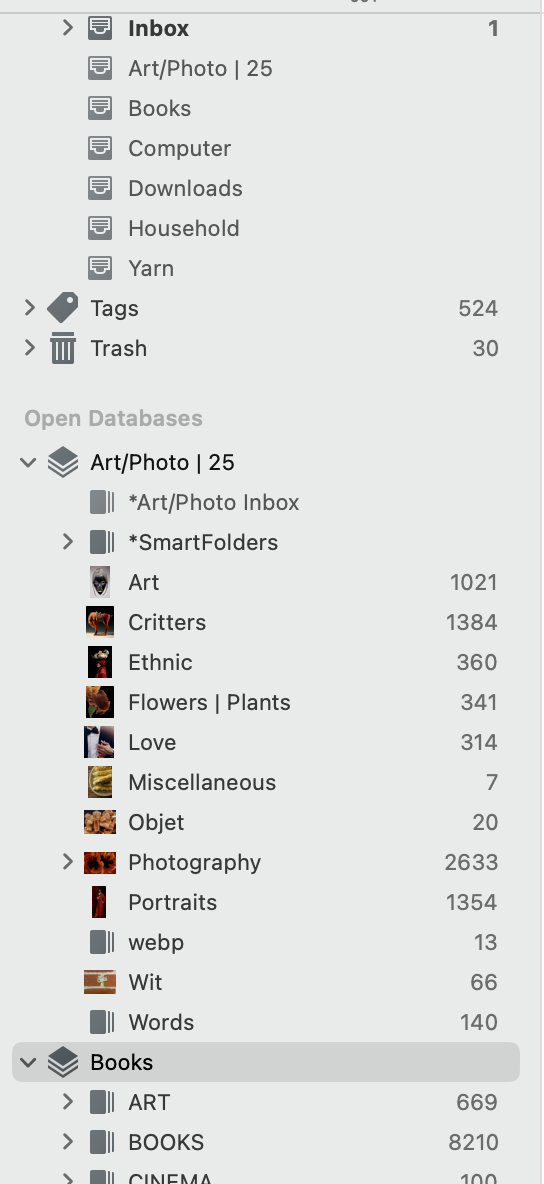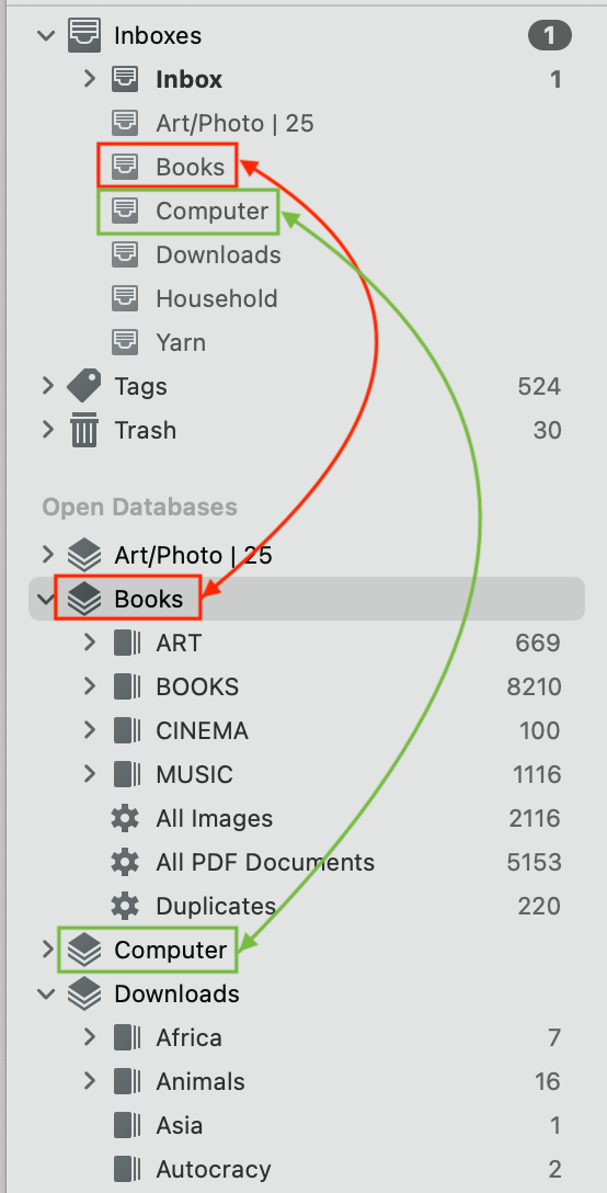 Yes, they are up with the main Inbox, but they aren’t in each database, like they were before. ArtPhoto is up above and in the database, Books is up above, but not in the database. I’ve been accustomed to putting things in the database Inbox for distribution – not up above.