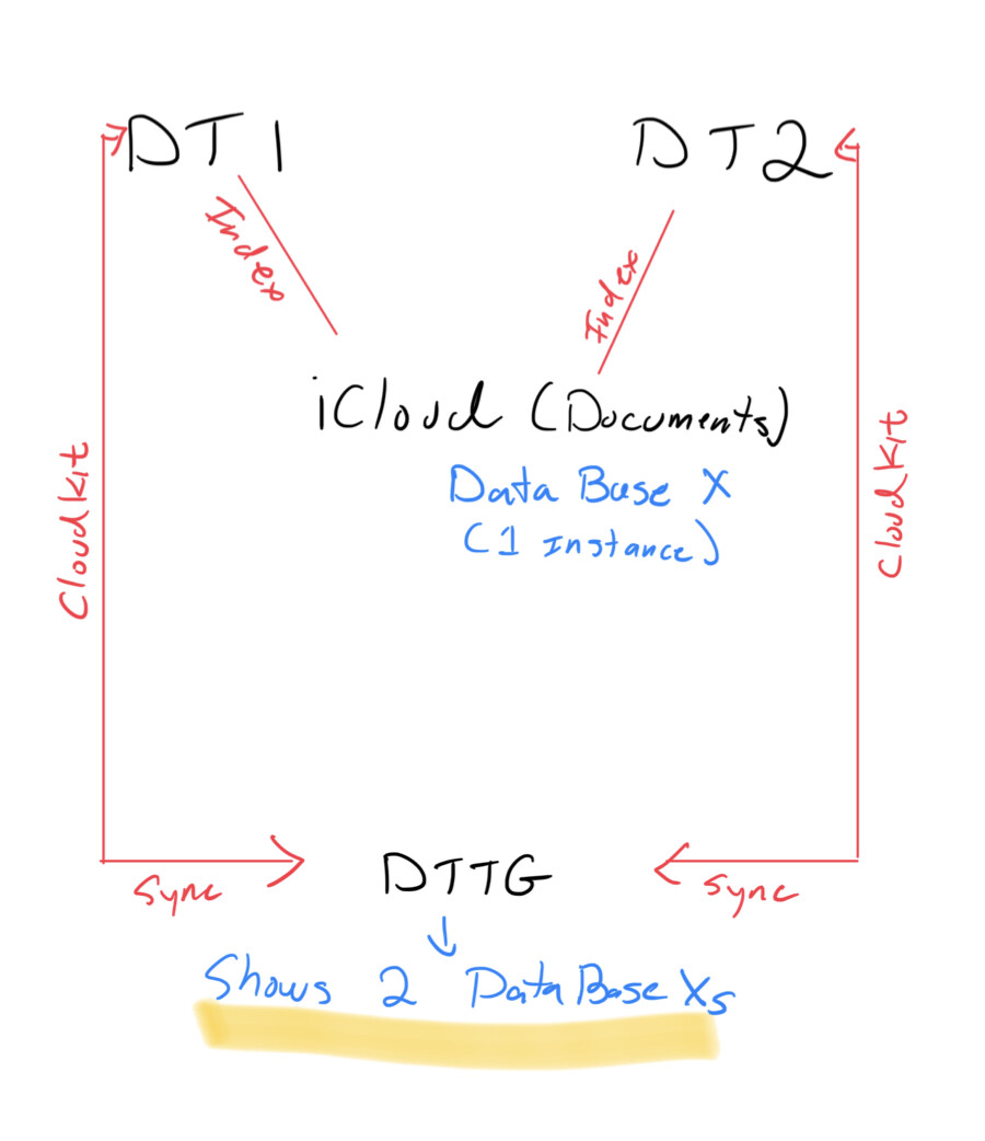 Regardless, what I had confgured initially - syncing only 1 of the Macs to DTTG via CloudKit seemed to work fine. Yet, cgrunenberg suggested that I needed to configure DTTG to sync to both Macs. Thus, my questions and drawing here.