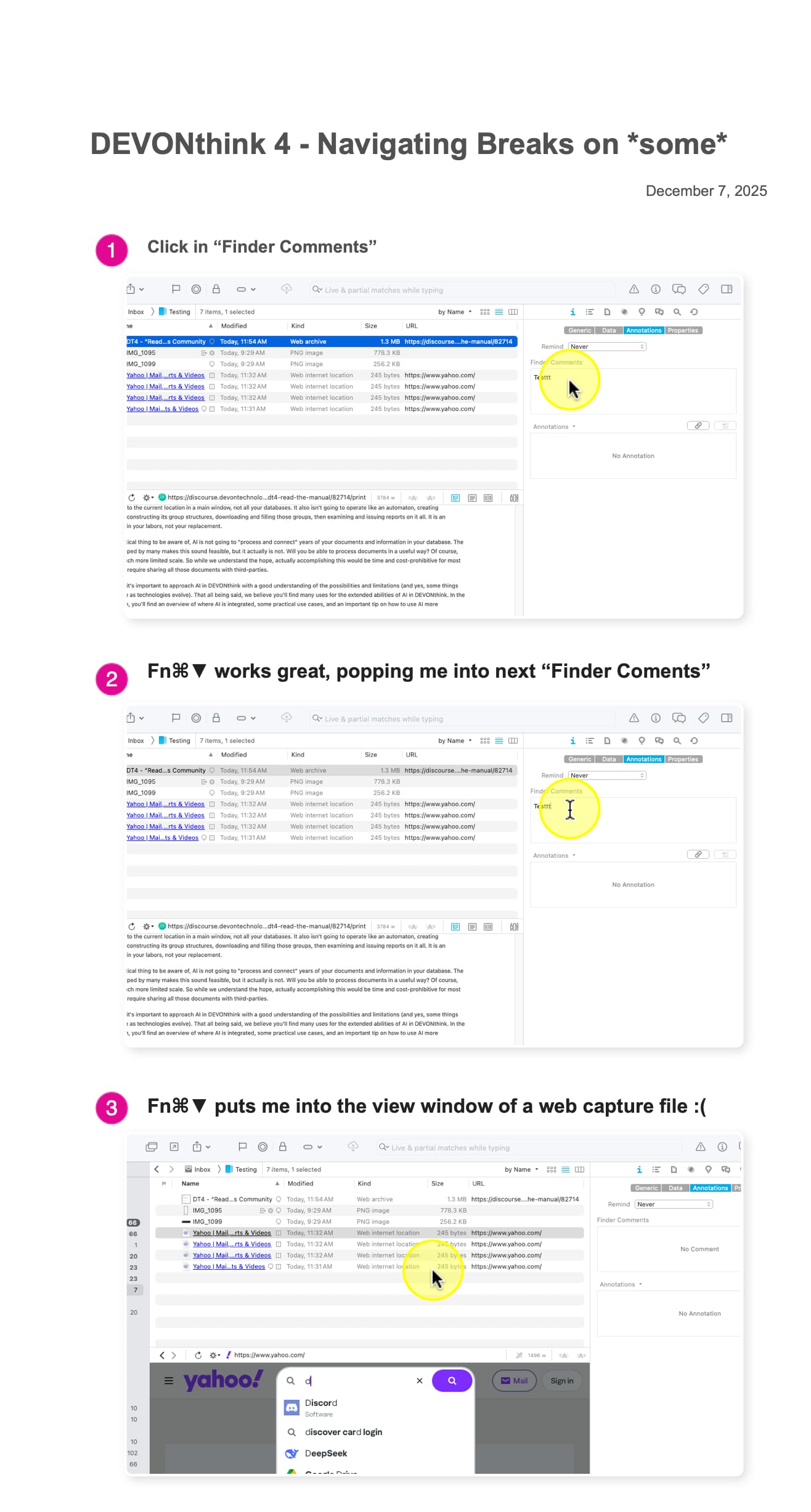 … And in my experience, Next/Previous Document does keep keyboard focus in the same spot in inspectors – even down to the exact unit in date-time fields. I don’t utilize bookmarks that much in DEVONthink, so I hadn’t encountered a website stealing focus.