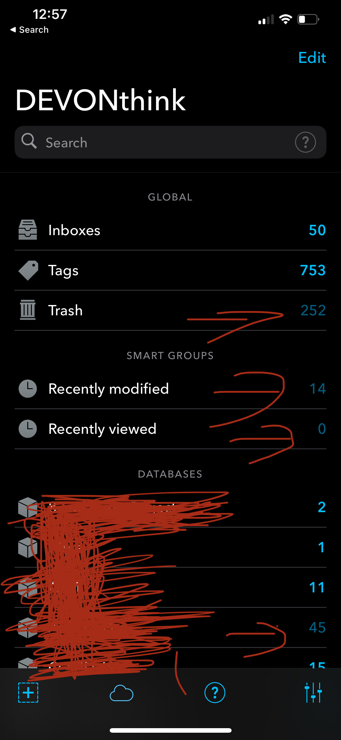 There is nothing showing folders or tabs grayed out (and there are no “tabs” in DEVONthink To Go).