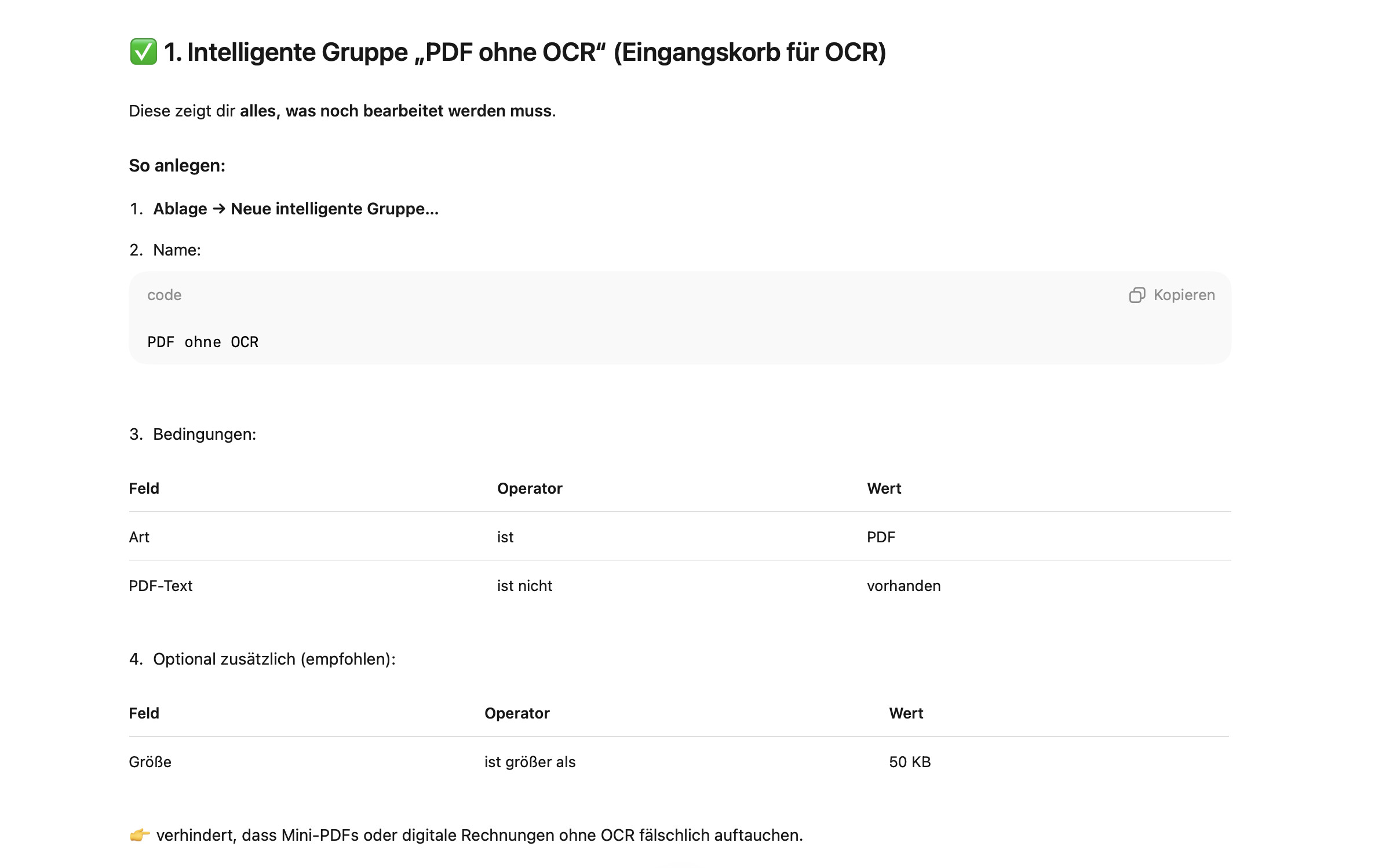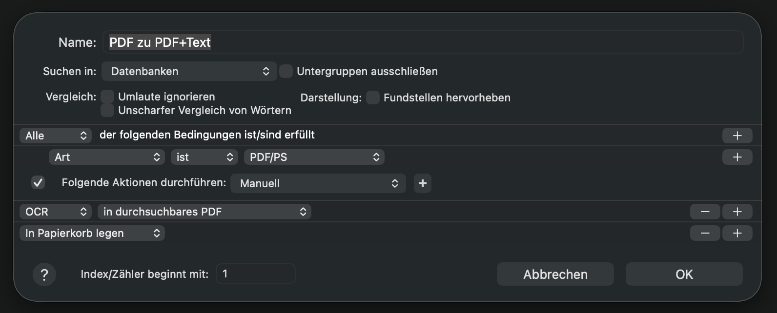 Fehlt nur noch deine Automation. Ich habe das heute gemacht, mit control + A alles markiert und dann mit rechter Maustaste OCR durchgeführt - über 1.300 PDFs. In den Einstellungen muss man noch einstellen, alte PDFs in Papierkorb verschieben sofern nicht angehakt. Dialog mit ChatGPT.