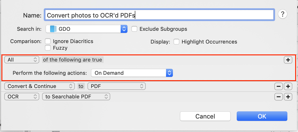 Obviously, I’d love to be able to automate this. I had hoped by using DT I could set it up so that I could drag and drop a folder into my DT database and have DT automatically convert all the JPG files nested within the files/groups into OCR’d PDFs. I guess I would settle for getting 1) above to just allow me to convert JPG to OCR’d PDF without triplicating or duplicating.