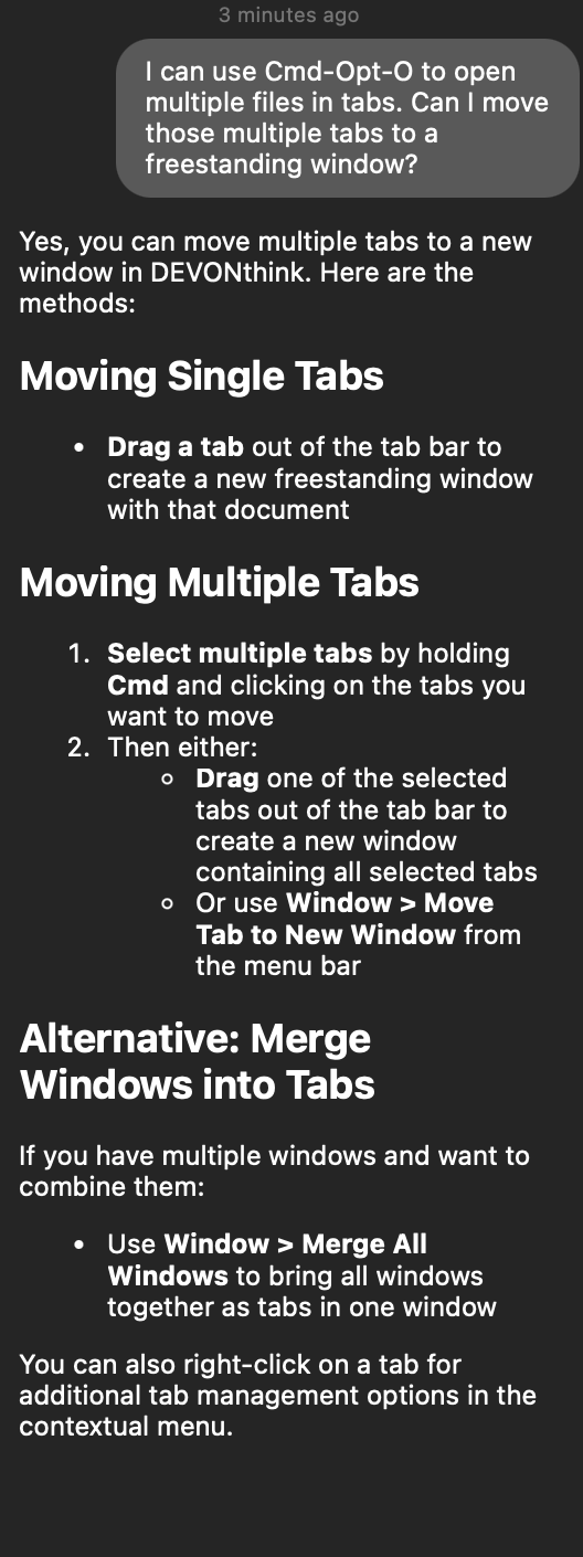 Can I then move those tabs to a separate window? Devonthink Help suggests I can use Window/Move Tab to New Window but I cannot find that option nor can I highlight multiple tabs with Cmd. Is this response hallucinated?