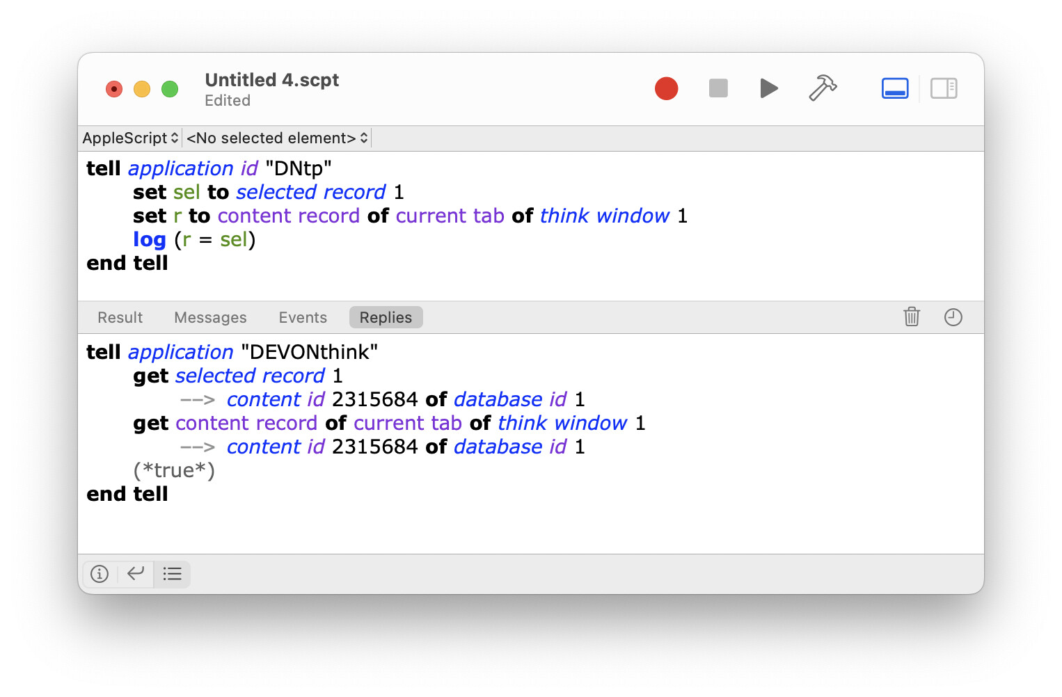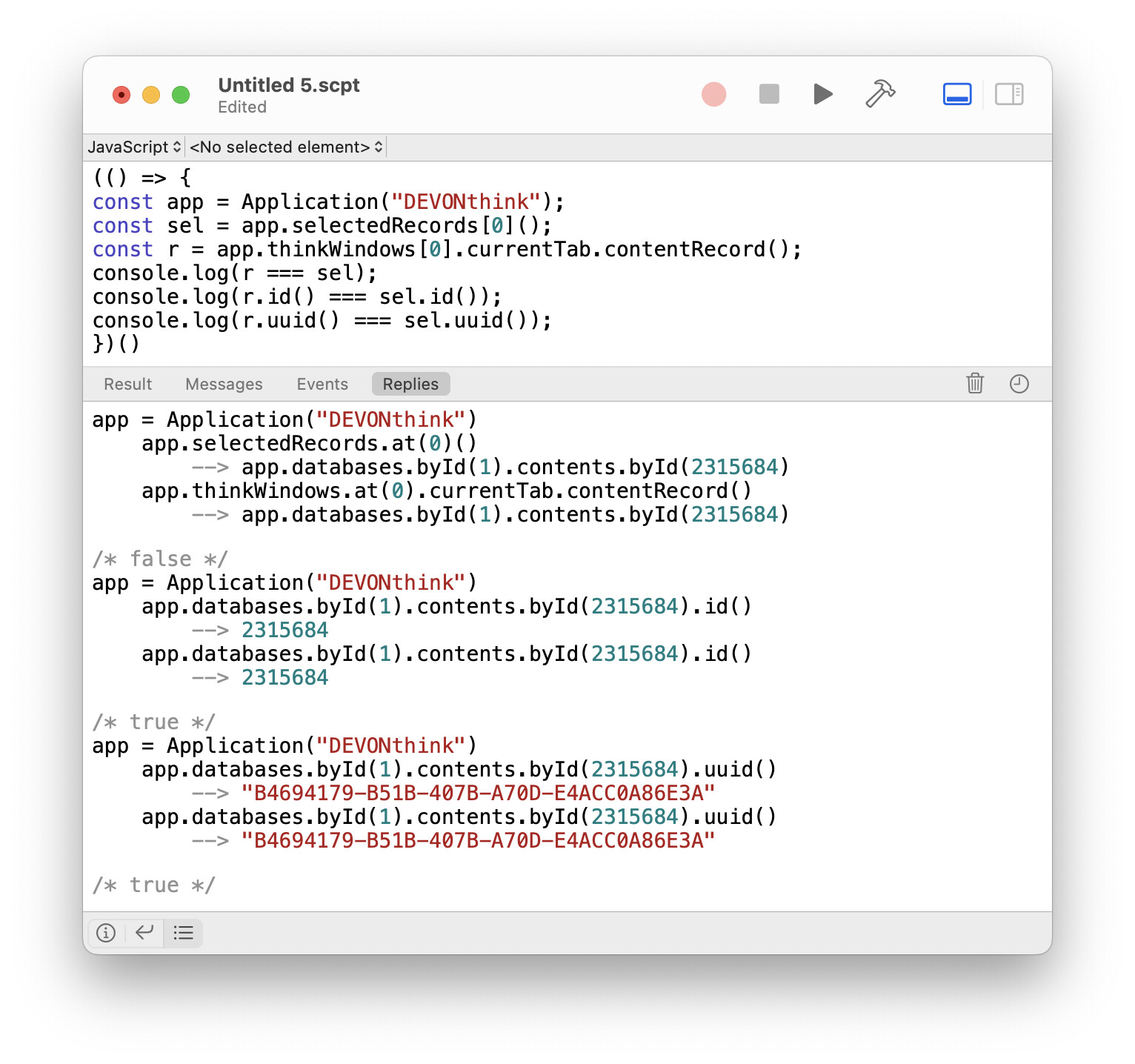But sure, uuid would fill the same role here. It’s just that comparing two object specifiers that look identical doesn’t work, it always returns false. So you have to compare some property instead, at least from what I can tell. (I guess comparing the string from getDisplayString also works). I just went with id since that’s what I saw in the log.