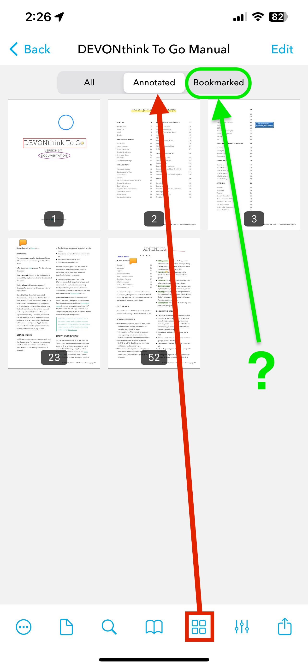 Thanks Bluefrog. I had indeed found the annotation tools but could not find a listing of those annotations or bookmarks. How am I to find them back again. Sorry to be perhaps ignorant of those functions but I can’t find them. I looked in the documentation.