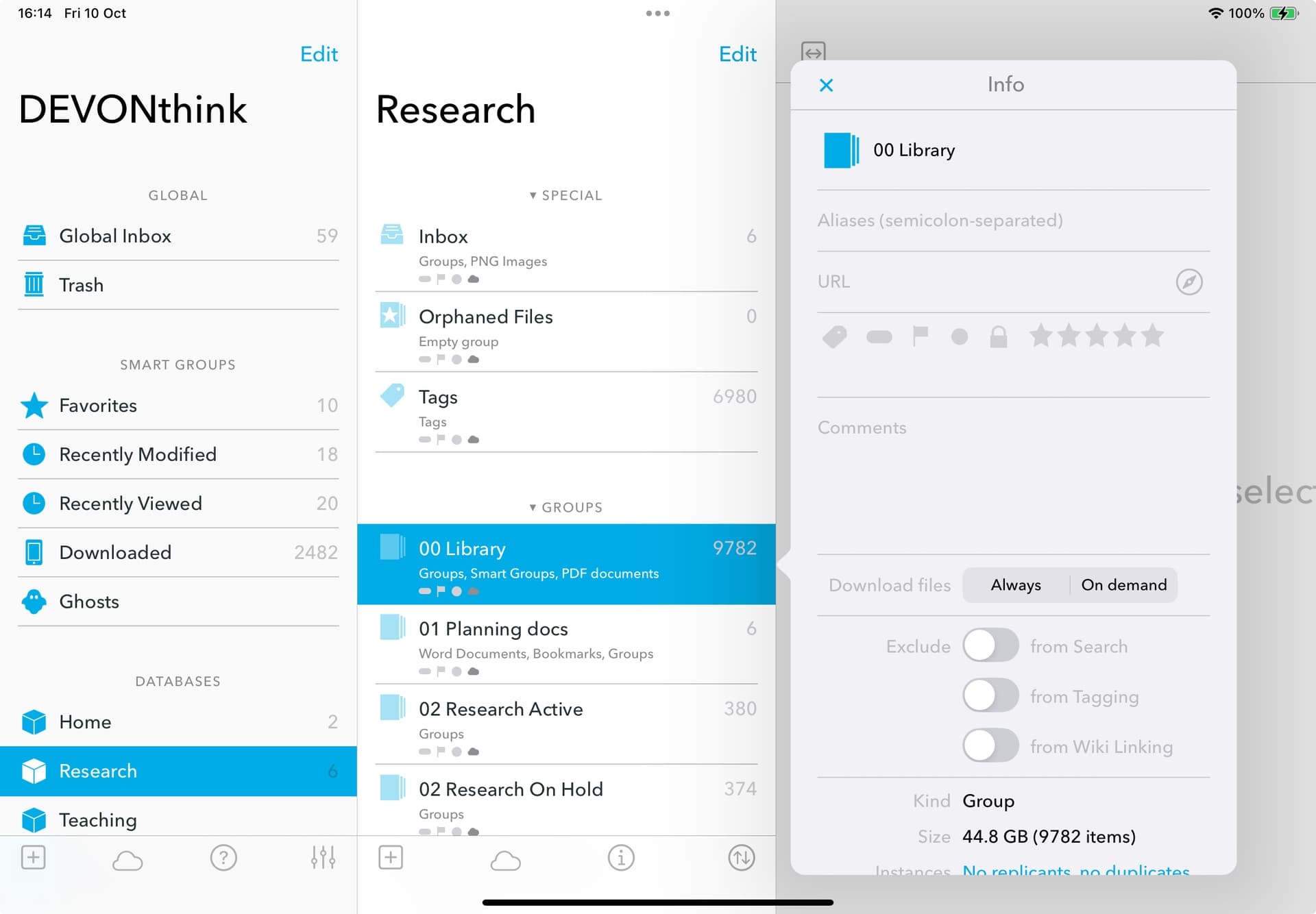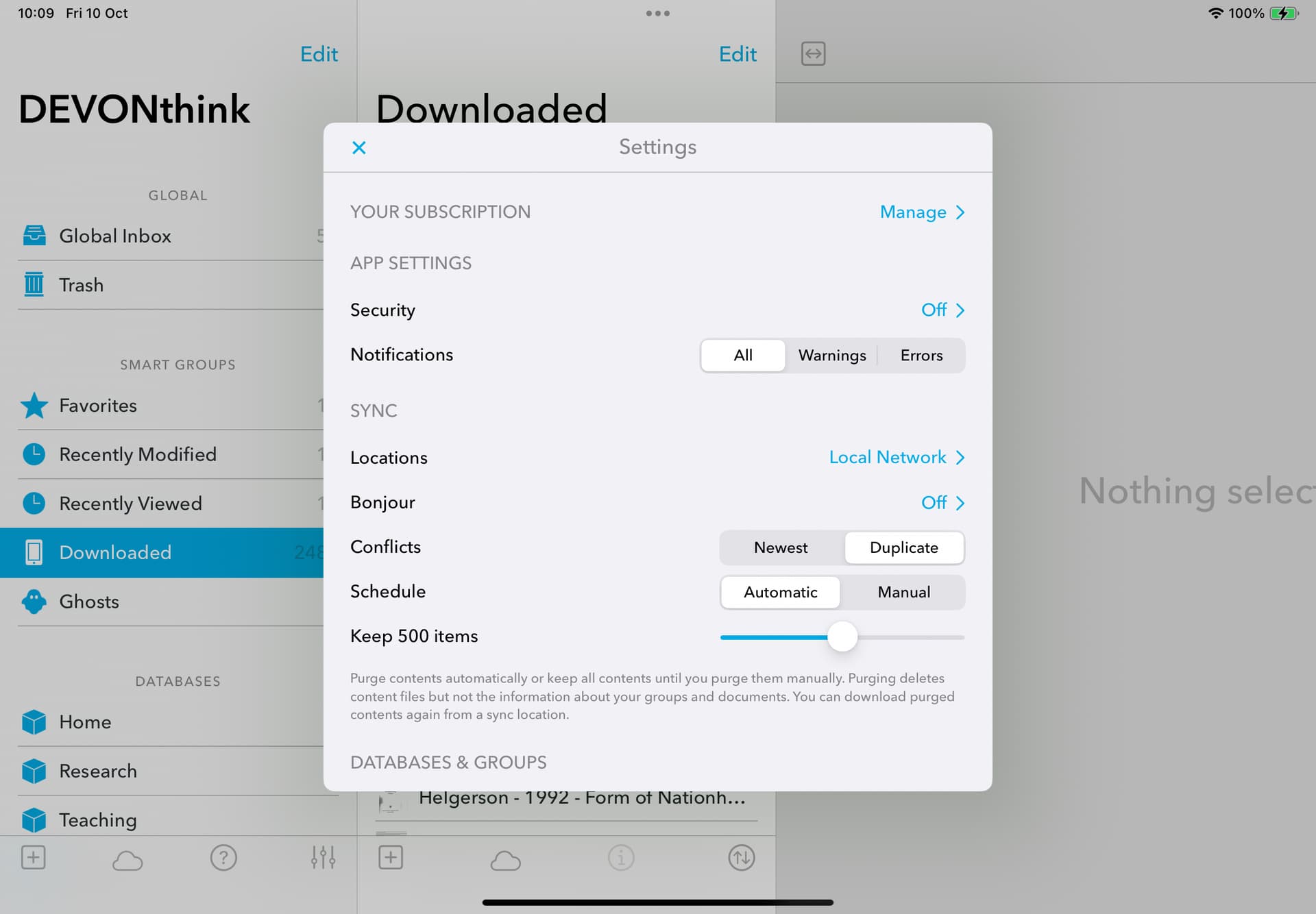 My first question is around purging items (which I understand doesn’t remove the item from the database, but removes the downloaded copy from the iPad, right?). Manual ‘purge’ isn’t available as a command for many large individual documents, which the manual suggests may be because the containing group is set to download always (I don’t think that this is the case). Changing the slider on ‘Settings’ from Automatic to Manual also doesnt’ make the purge command available.