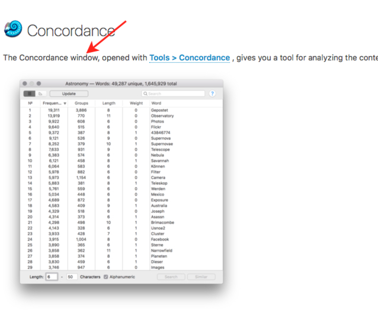 3a.) The Help documentation states the following: “The frequency graph shows a graph of the word frequency over the rank number of the word (see above)”. Rank number appears to be referring to the first column in the Help documentation image, which does not correlate with the current sidebar Concordance view, which merely starts with Frequency, as in – there is no Rank column? Is this no longer available?