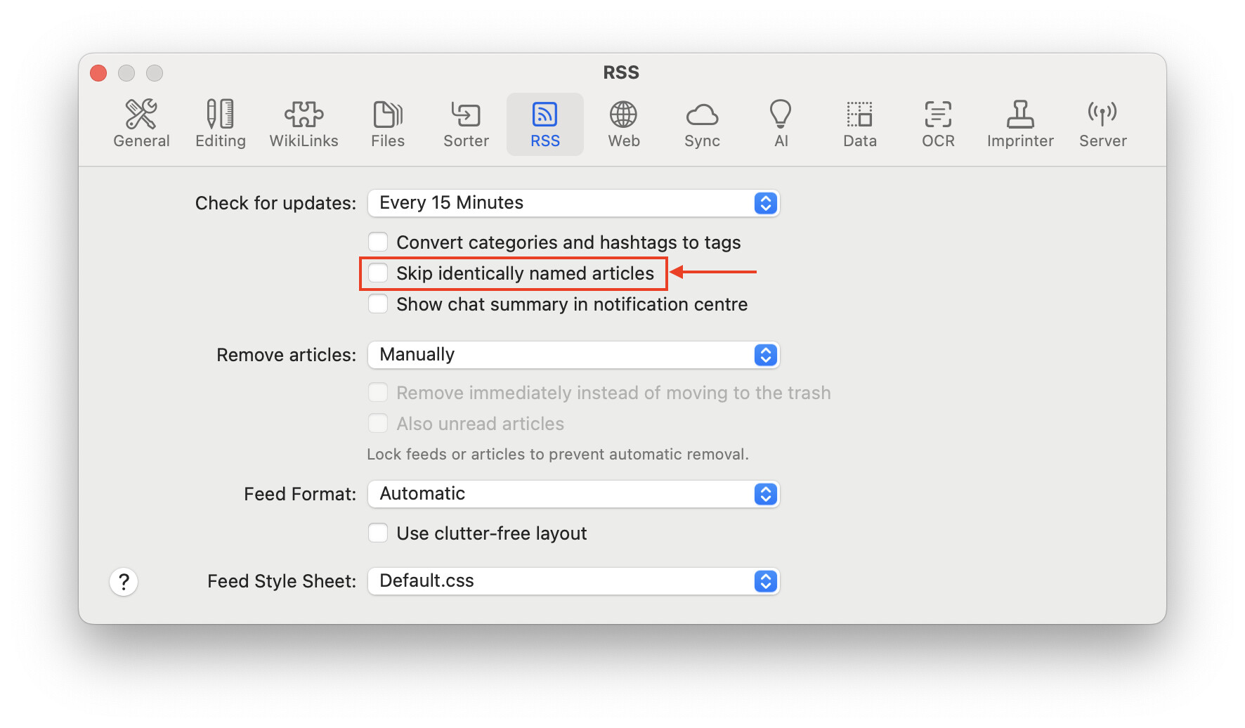 Yes, see below. – Perhaps this option only applies to identically named articles in the same RSS feed? This is not the case for me. I receive the same RSS message in different RSS feeds.