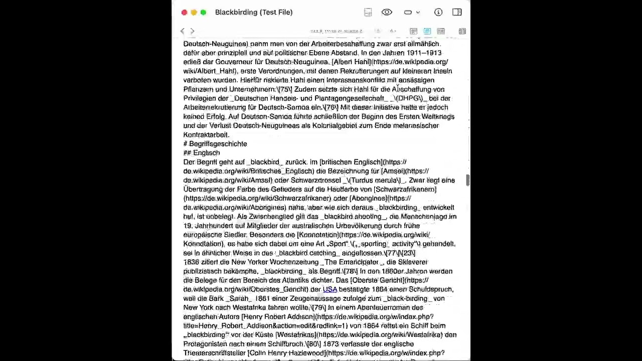 In the meantime, I’ve created a screencast with a Wikipedia entry (Blackbirding – Wikipedia) as an example (I copied the entry w/o the images, but preserving all formatting and links):