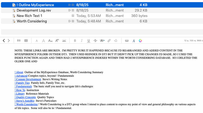 Wow Jim, that’s good to know. I just tested it. I created a new RTF and the font appearance was small. I then zoomed that document so that it was readable to me. I then created another new document and it started out zoomed to the same degree as the new one I’d just created. Then I went back to other RTF’s in the database, and they were also zoomed to the same level, all readable now. Thank you so much.