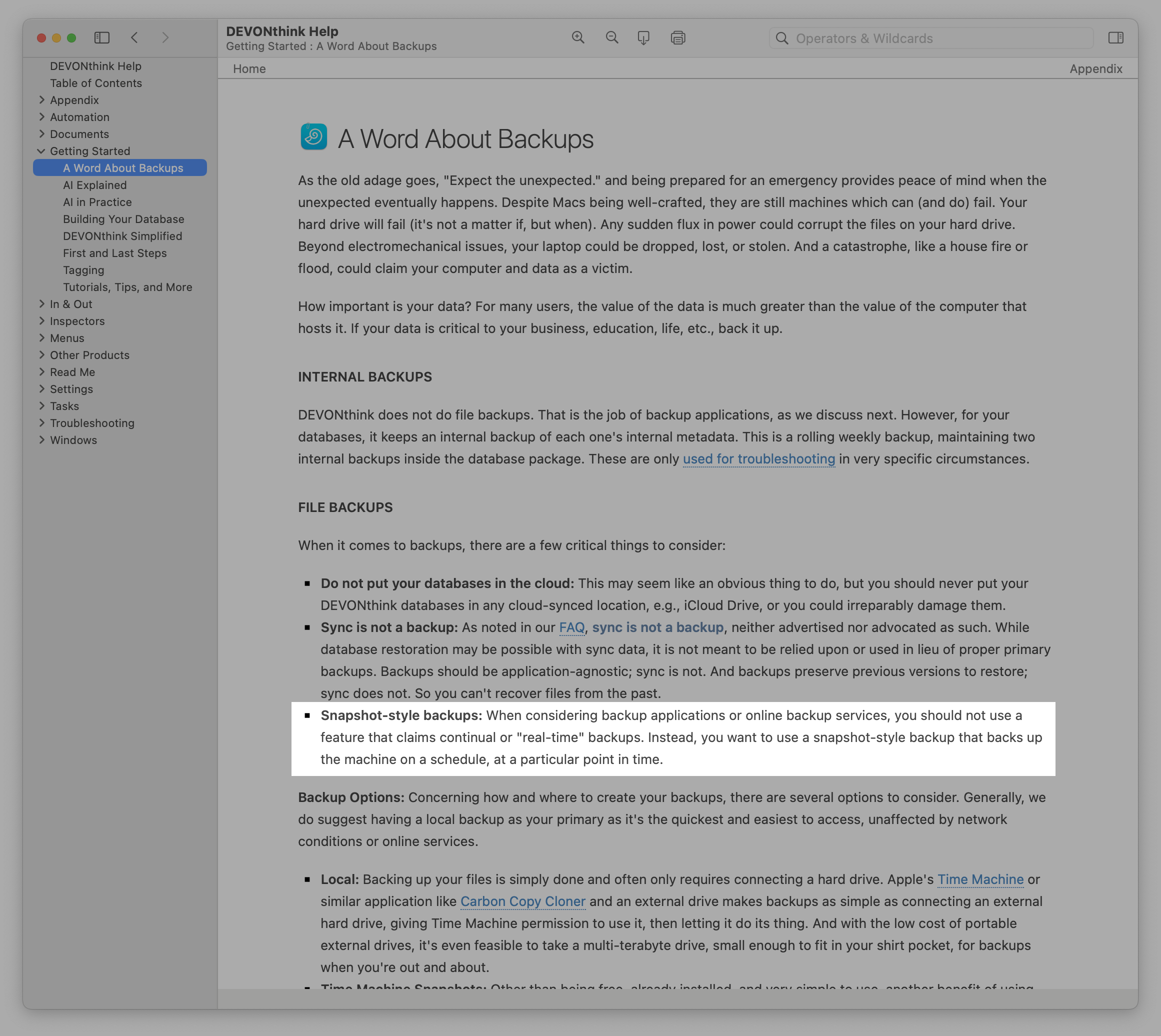 One further thought: if the Time Machine drive is permanently connected, it automatically decides which snapshots to keep (hourly/daily/weekly). Since these snapshots are created without regard to whether DEVONthink is open or closed, it is theoretically possible that Time Machine never actually retains a snapshot of a fully closed .dtBase2 file. In other words, even if Time Machine occasionally captures a clean state, its rotation may discard that and keep only snapshots taken while DEVONthink was open. This does not mean Time Machine is “unsafe,” but it does mean that retaining a known-closed version of a DEVONthink database is not guaranteed.