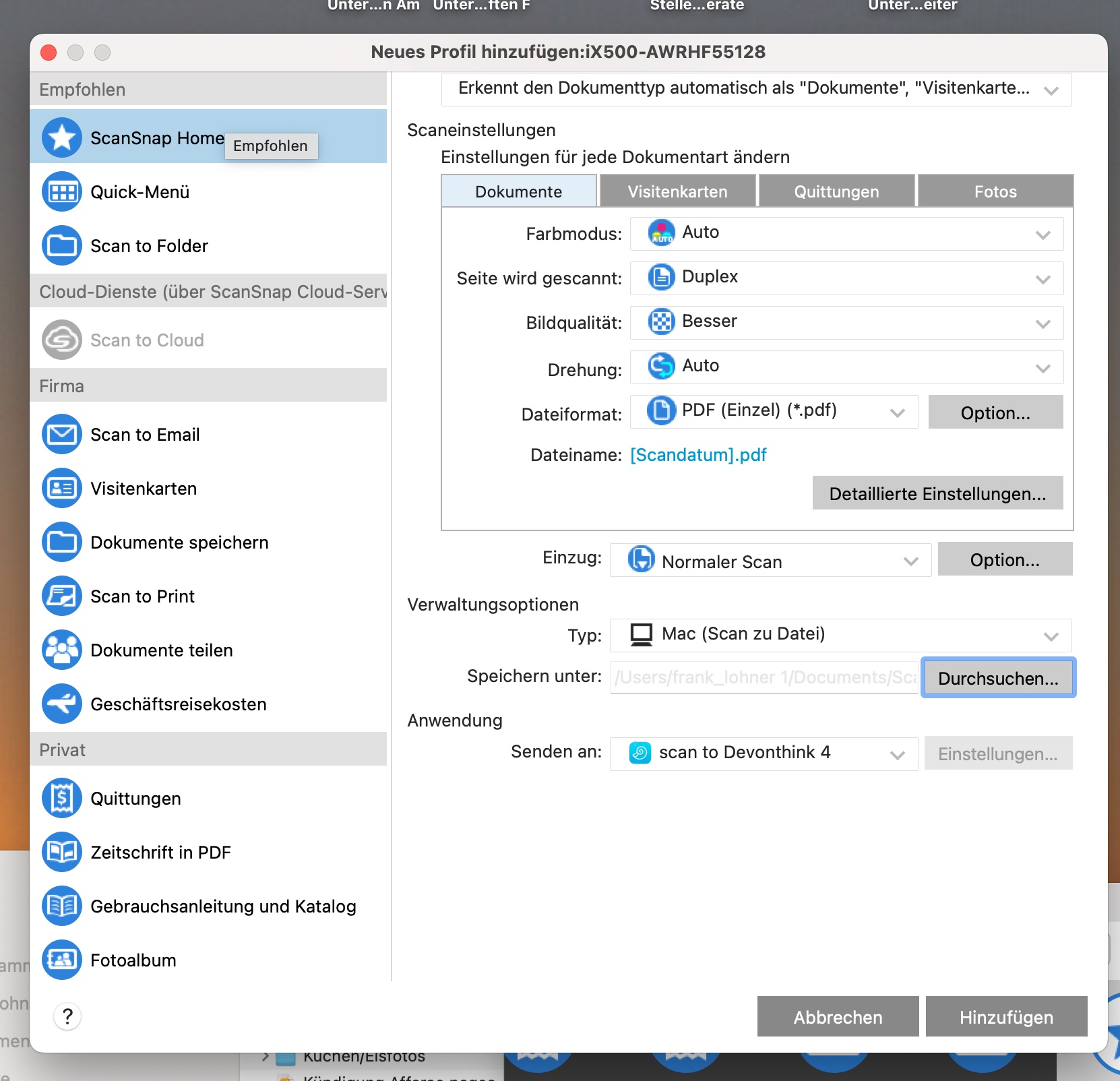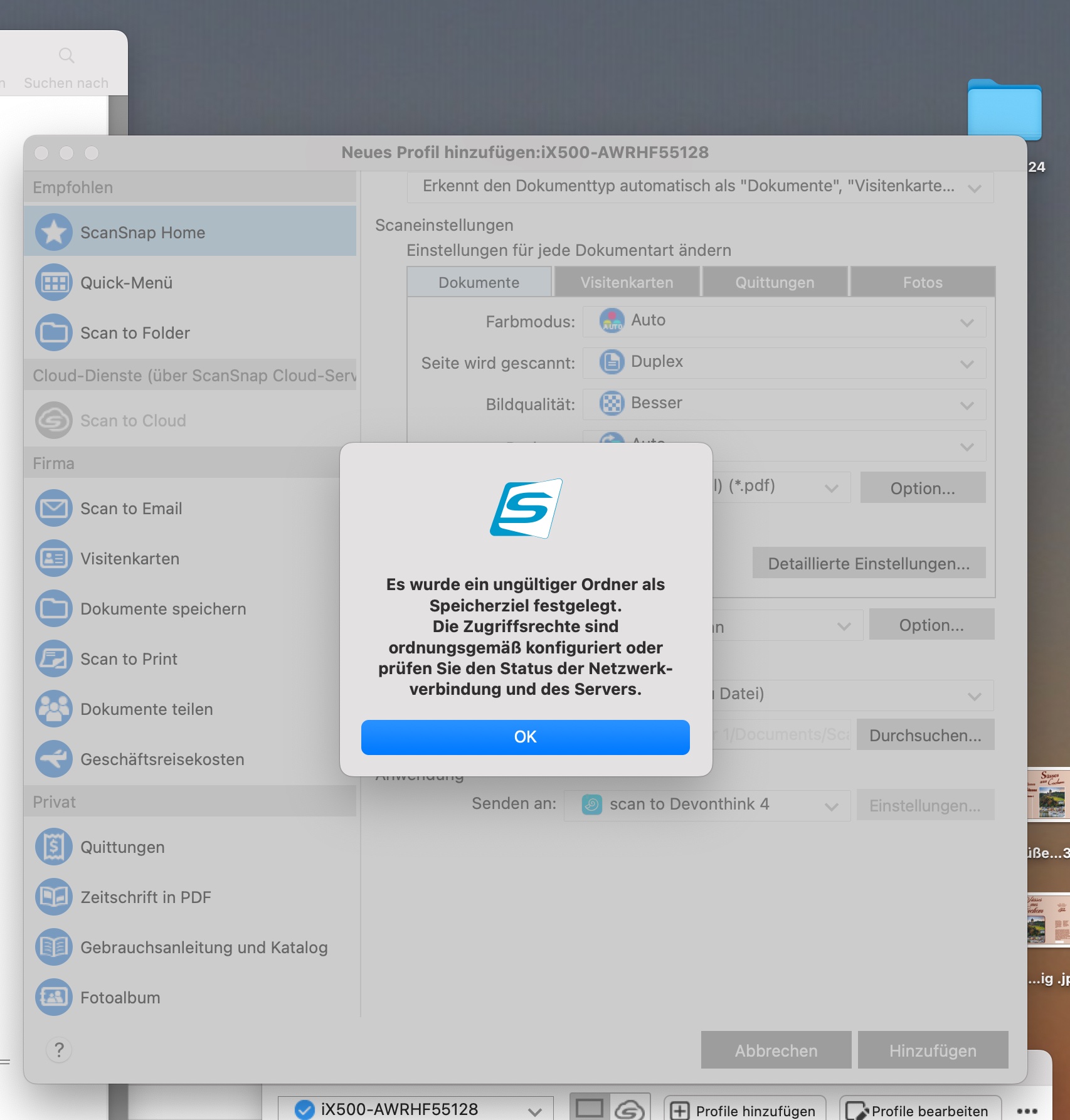 In Devonthink 4, I cannot create a scan profile in ScanSnap Home. An error message always appears stating that an invalid folder has been set as the scan destination.