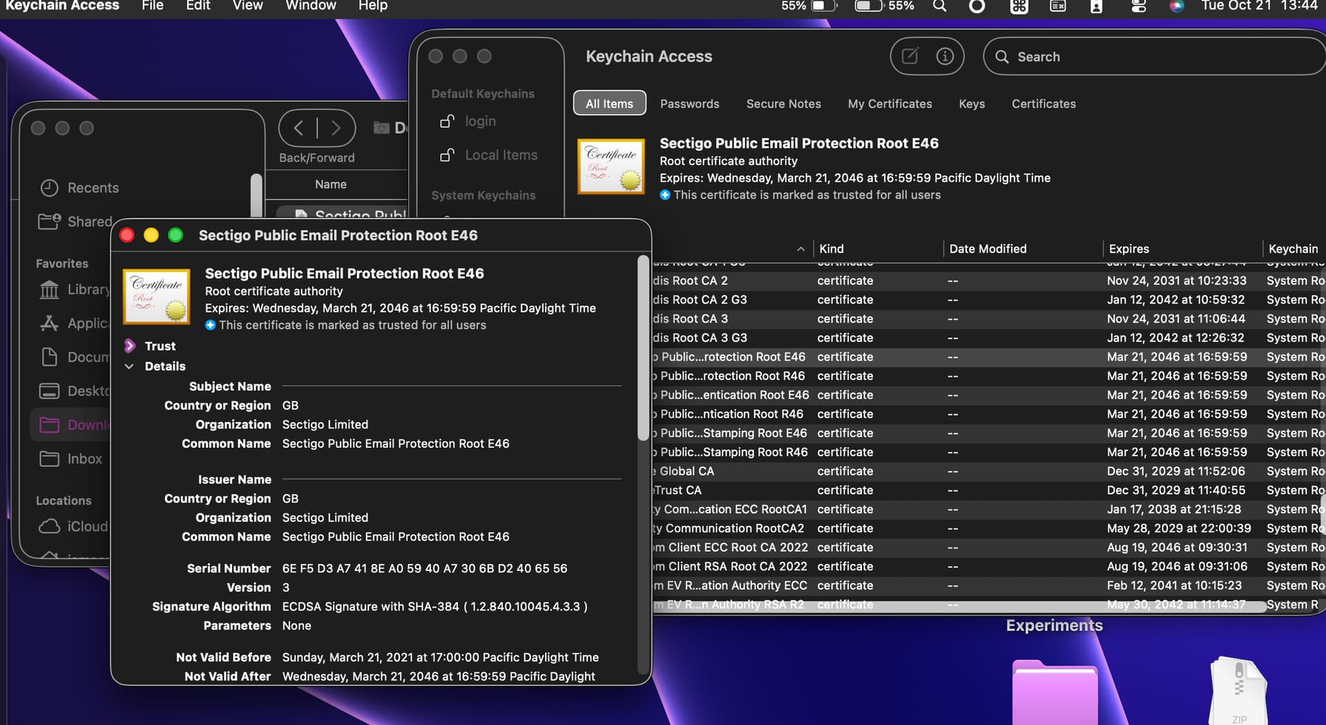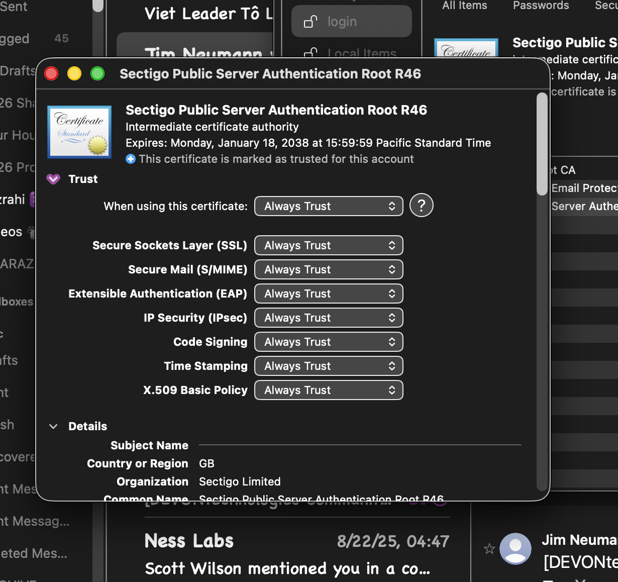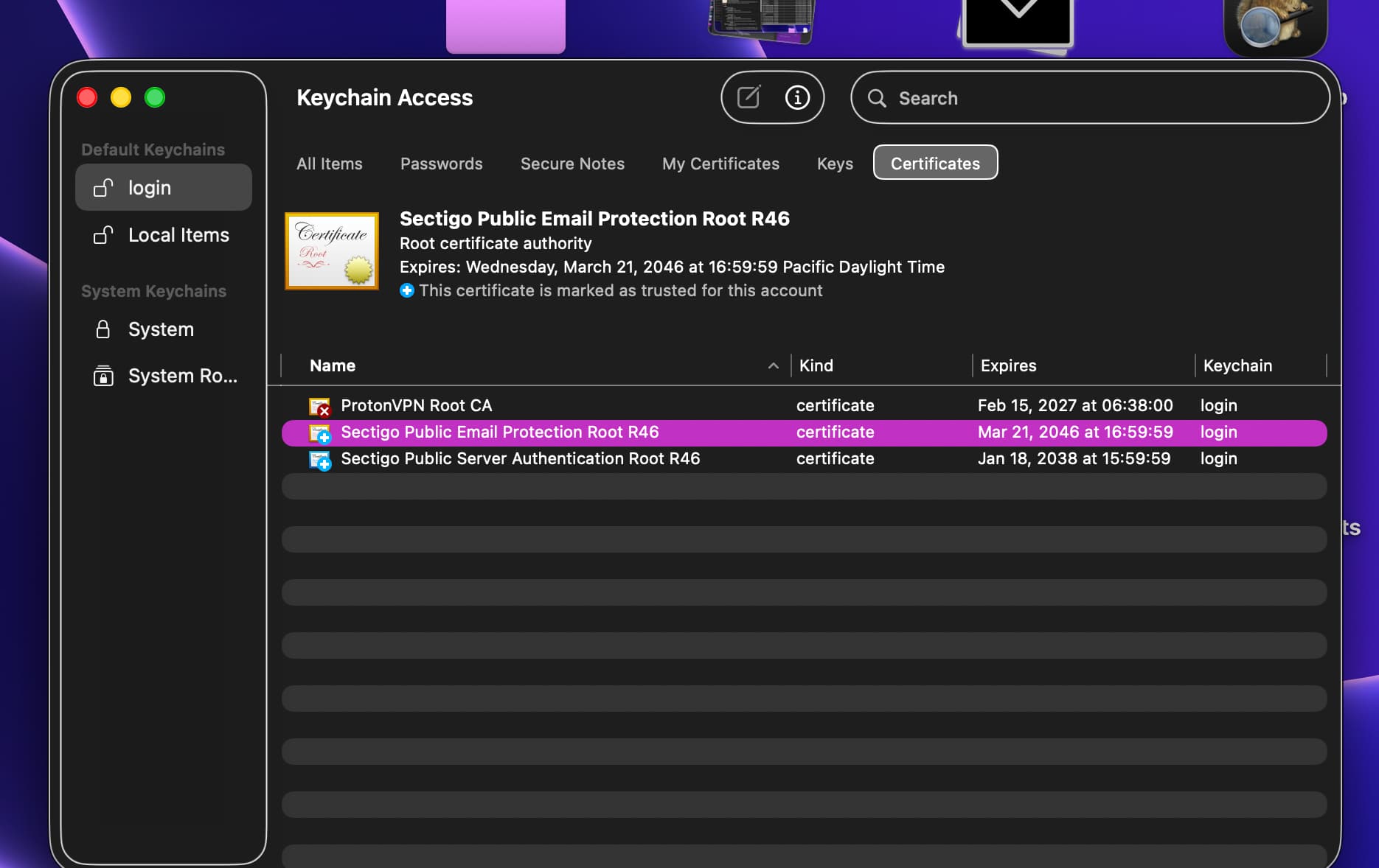 .crtfile to install it in Keychain Access. - Select the Sectigo Public Server Authentication Root R46 certificate in Keychain Access and you should see a message it is valid in the details above.