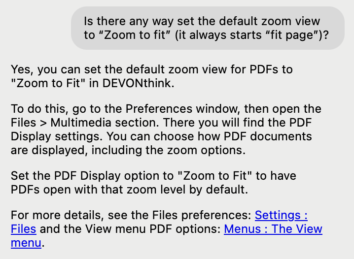 The help viewer’s chat of DEVONthink 4 (Pro/Server) can answer such questions too and immediately: