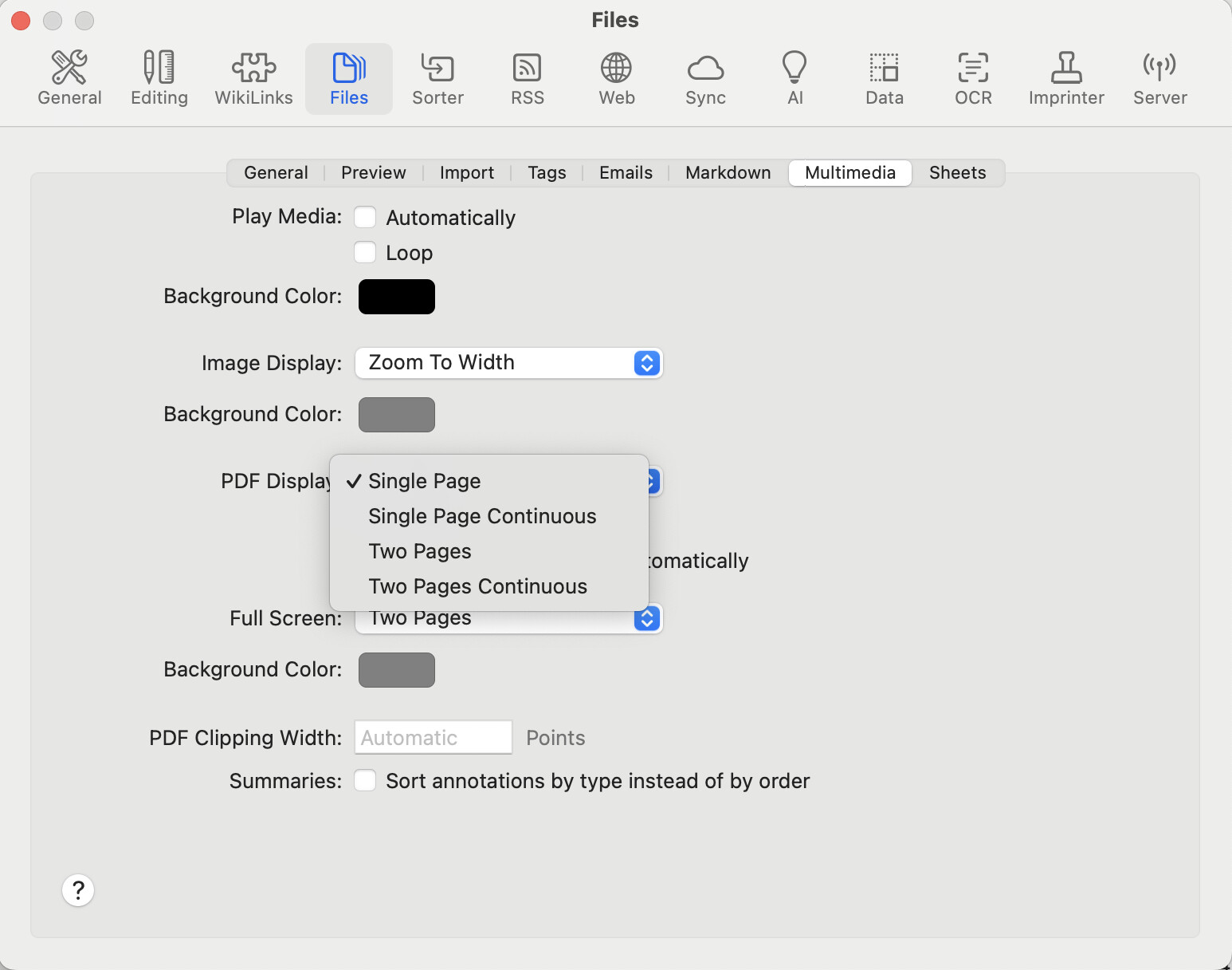 Files > Multimedia > PDF Display and choose a Non-Continuous mode.