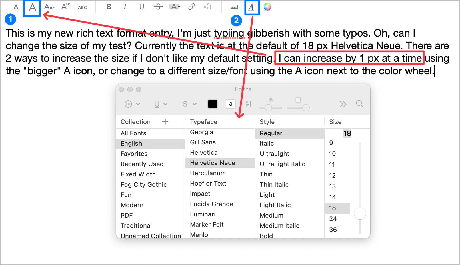 In addition you can change the text size for an individual note using the handy A icon: