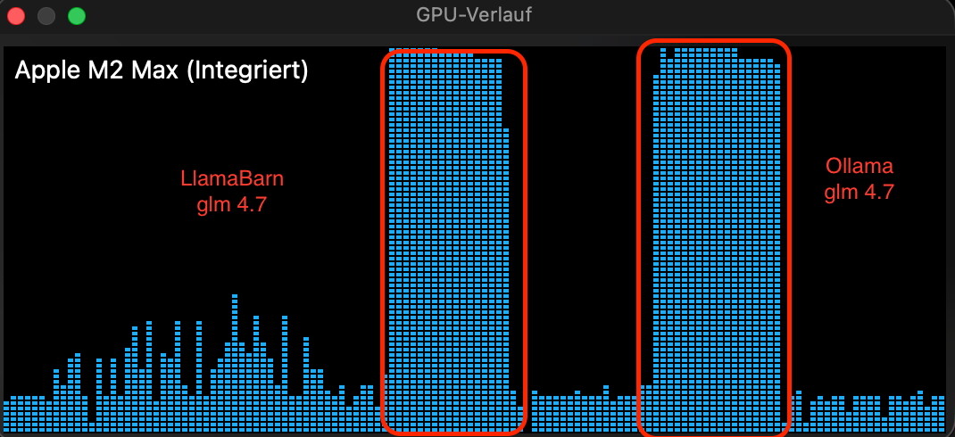 - LlamaBarn used up more memory (probably due to larger context), but kept working; Ollama stayed green in respect to memory