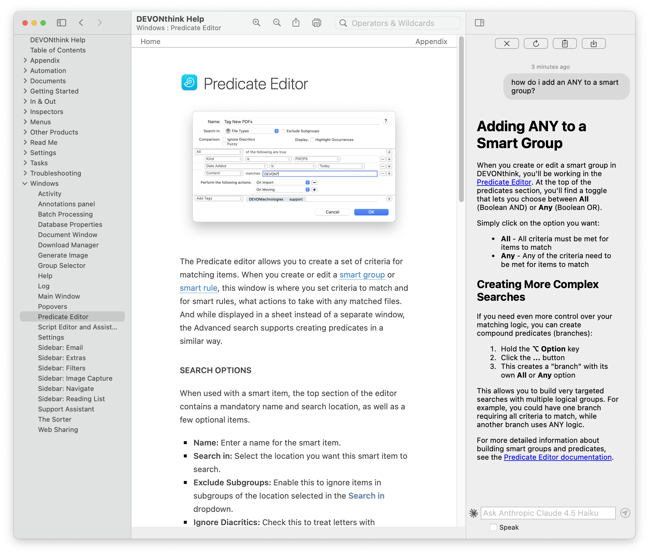 Also re: the documentation, DEVONthink’s Help Assistant in DEVONthink 4 gives you answers with a much higher degree of accuracy compared to chatting with ChatGTP, etc.