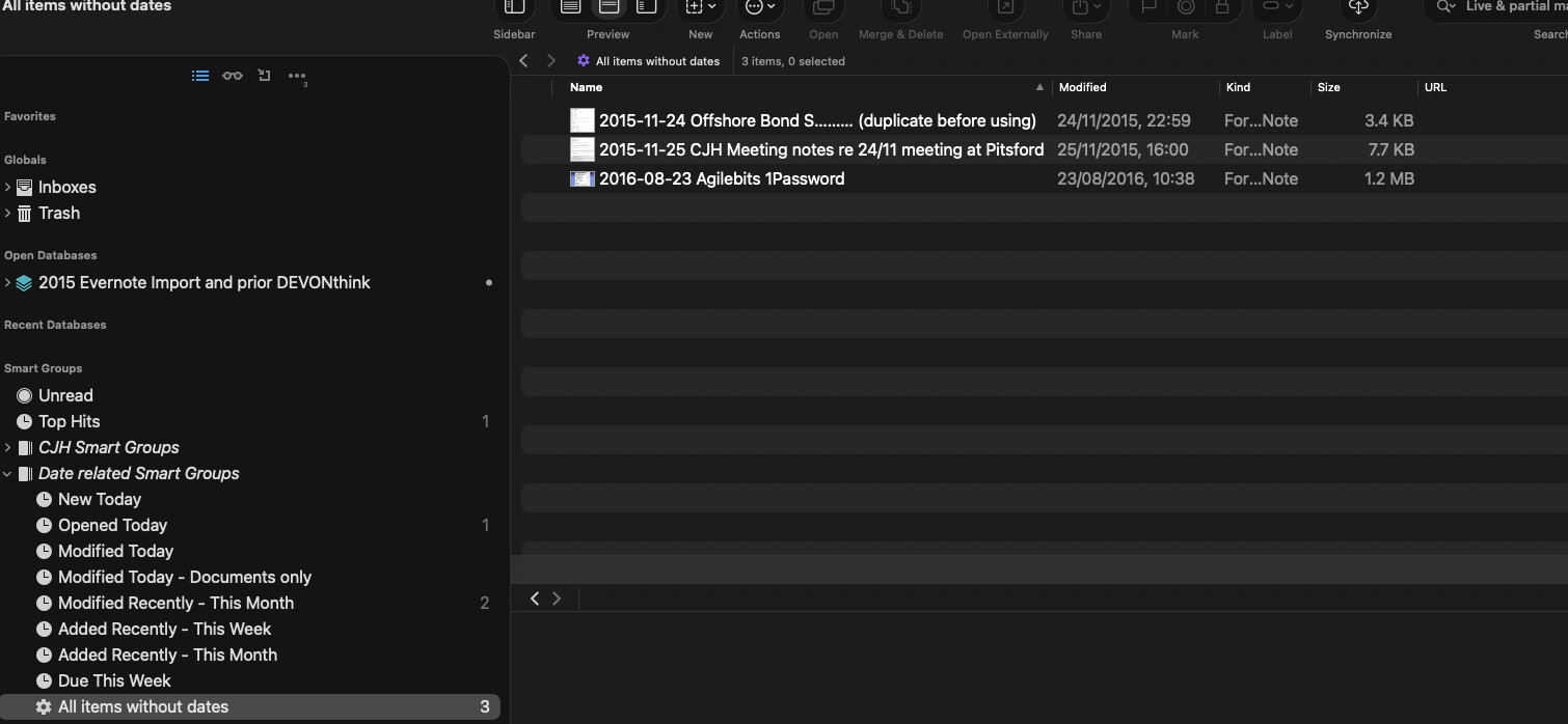 I have been tidying up a number of old databases, and adding filing dates to the items names via batch process in some instances, and via smart rule in other instances.