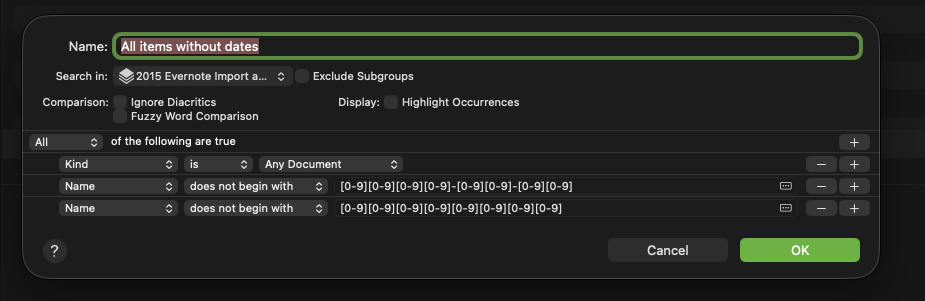 To check progress and once satisfied with the files selected then change the date / name structure I have created the attached smart group to identify items without dates.