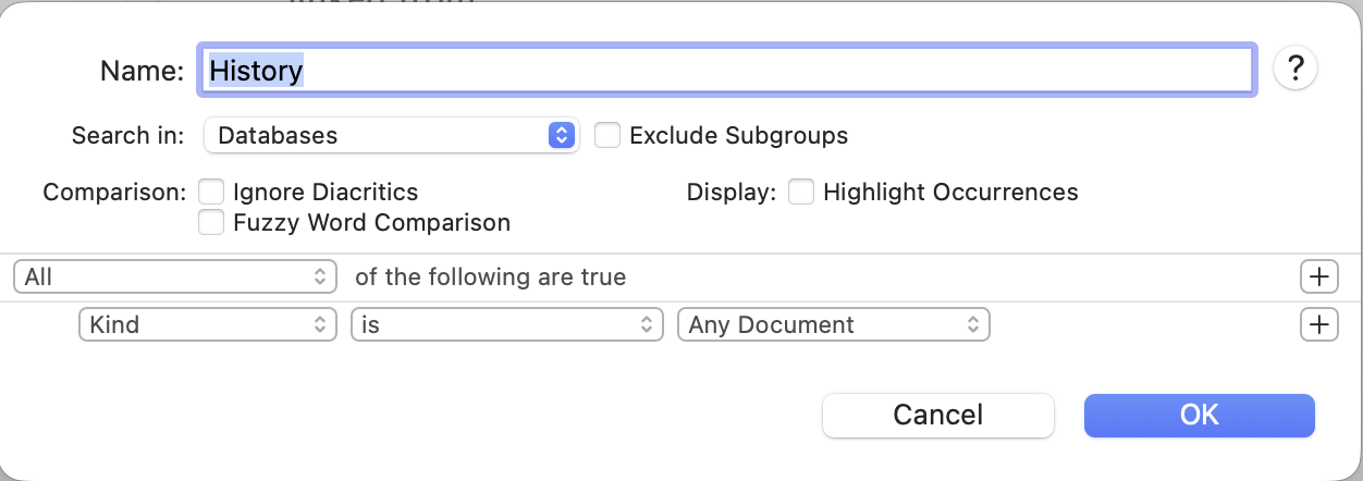 My databases are synced to iCloud. The above Smart Group search came with DT4. The “Search in: Databases” causes DT4 to search in all iCloud folders and incorrectly populate the Item List with documents that are not in DT4 databases but that are in other iCloud Drive folders. DT4 documents are correctly displayed in the Item List. This happens with every Smart Group search that has “Search in: Databases” as the search location.