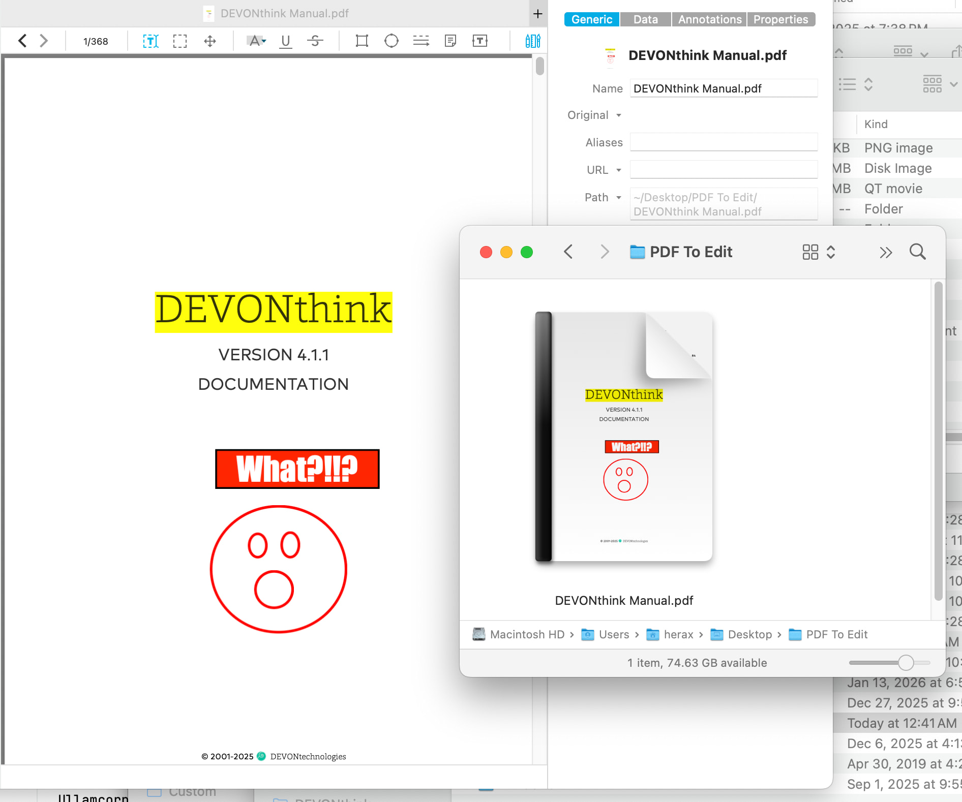 I understand, of course, that any annotations I make to PDFs in DT on this new indexed db, such as Imprinter, will not be reflected in Finder; I will just see the original document in Finder, not annotated, but annotated in DT.