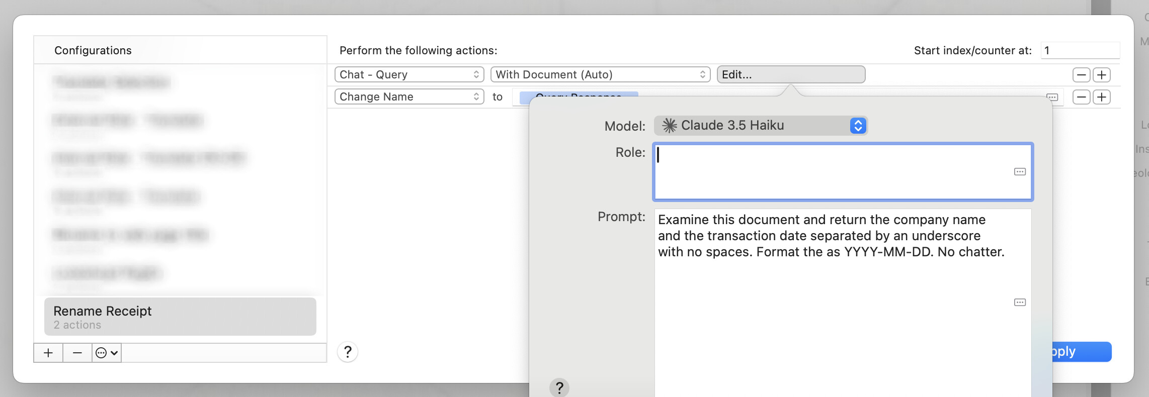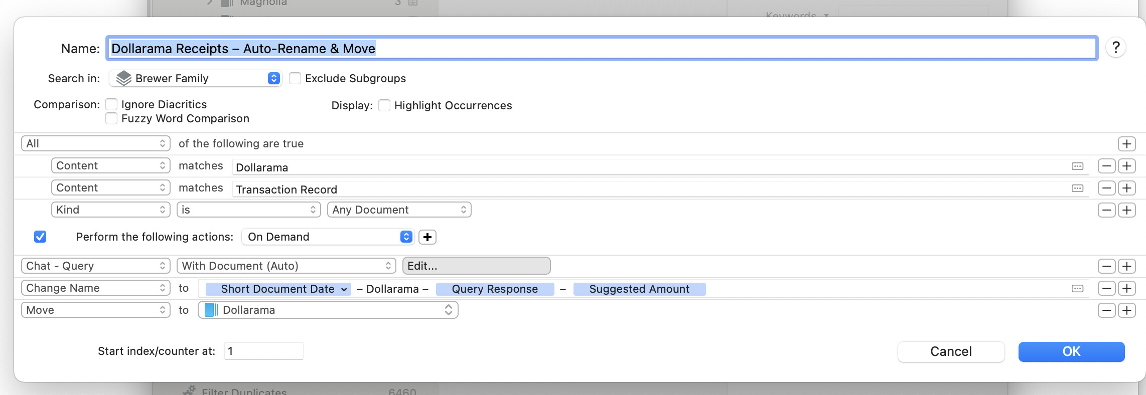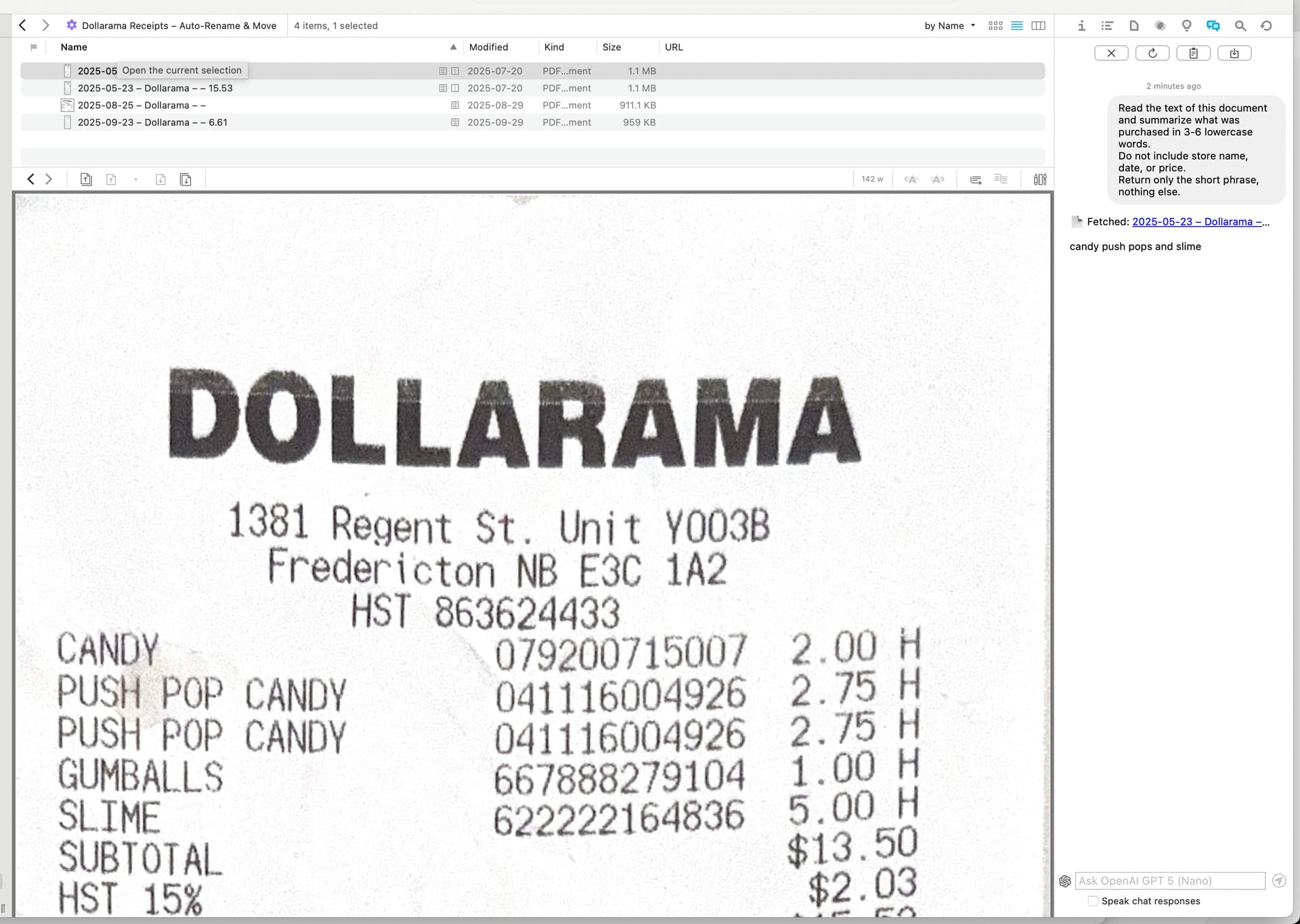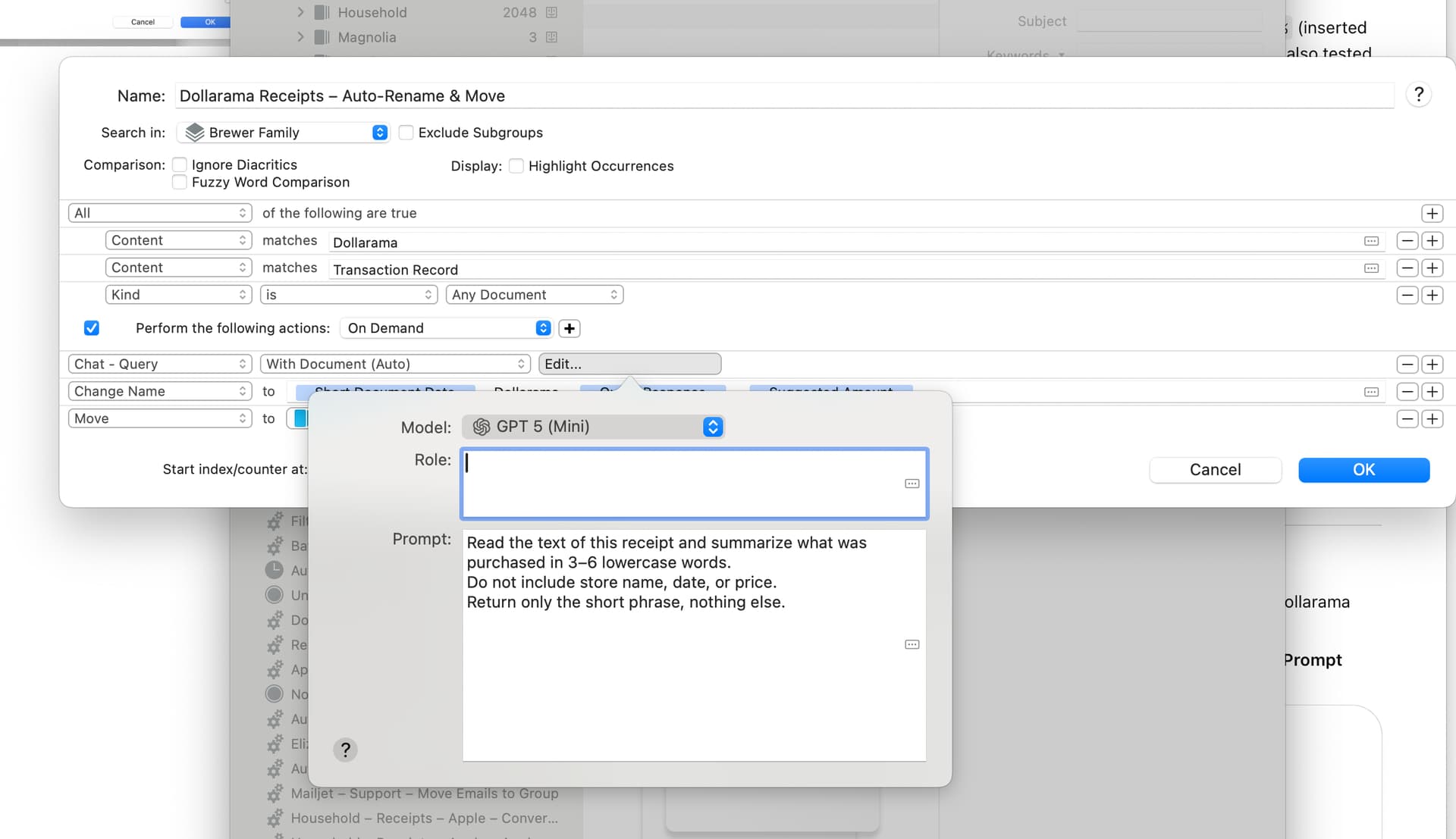 I’m experimenting with DEVONthink 4’s AI integration (ChatGPT via GPT-5 Nano model) and trying to build an automated Smart Rule for renaming receipts. The idea is to have ChatGPT read the text of each receipt and output a 3–6-word summary phrase (e.g., “snacks and stationery”) to use in the filename.